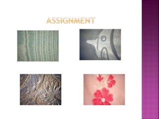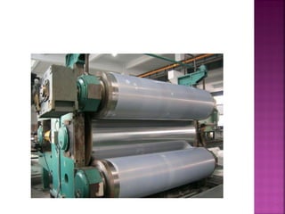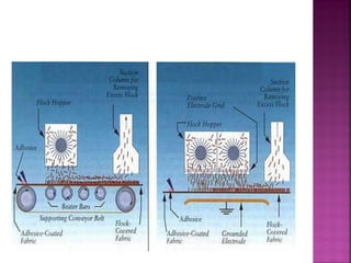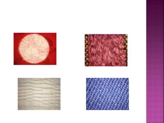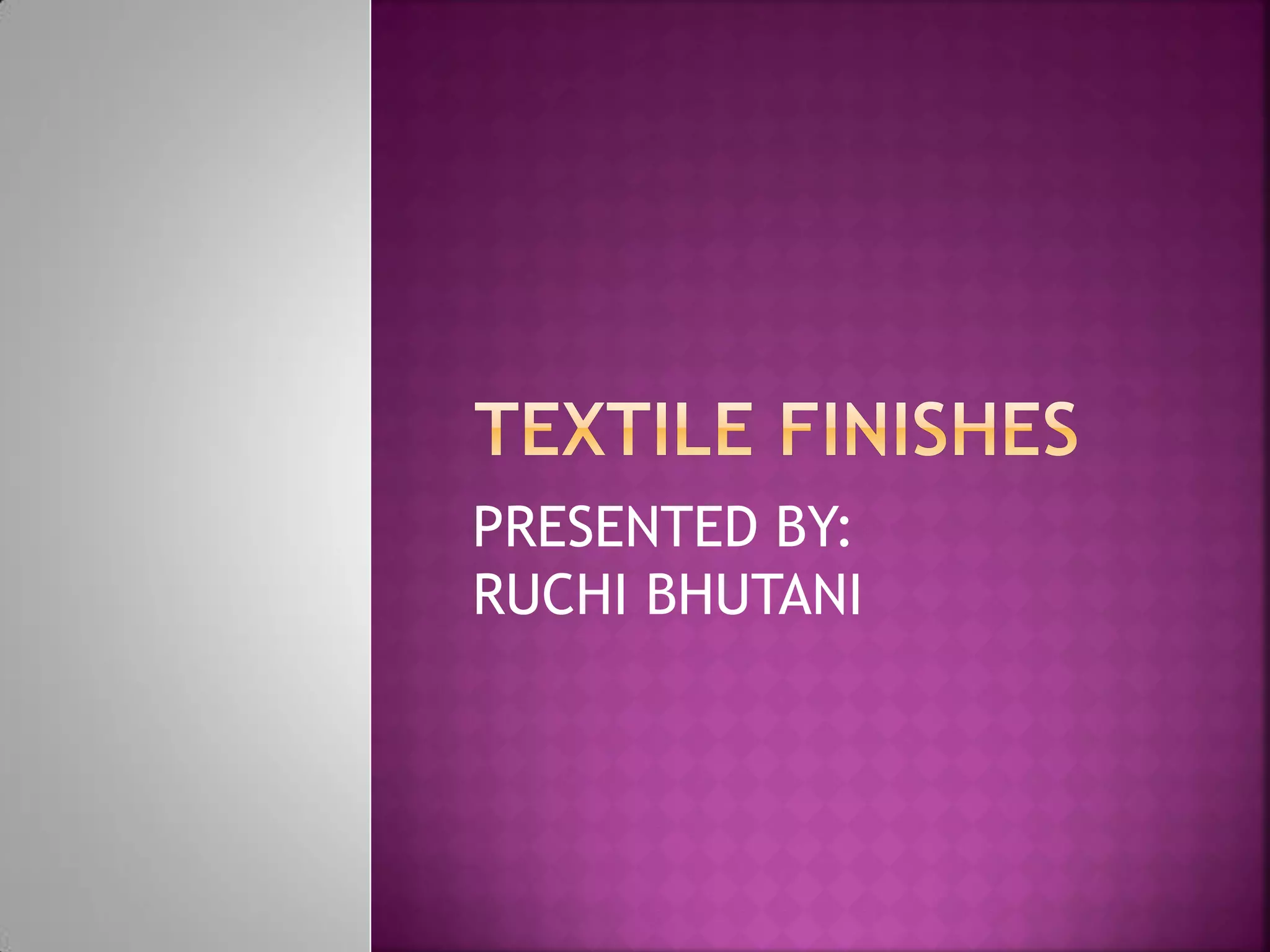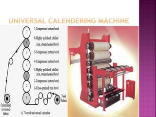 Fabric finishes are applied after fabric production to improve appearance, feel, or properties. Aesthetic finishes influence texture, luster, drape, and hand. Calendering uses rollers to impart finishes like glazing, moire, or embossing. Other techniques include brushing, shearing, and flocking to modify texture. Functional finishes provide benefits like wrinkle resistance or stain release. A fabric's fiber content and construction determine suitable finishing methods.