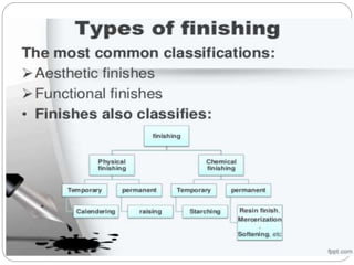 Textile finishing involves mechanical or chemical processes to increase a material's aesthetic and functional properties. It is done to make materials more presentable and durable for customers. There are different types of finishes including aesthetic finishes to modify appearance; functional finishes to improve performance; physical/mechanical finishes using treatments like calendaring and napping; and chemical finishes applied with chemicals and curing. Examples of specific finishes are crease-resistant for wrinkle-free fabrics, water-repellent for outdoor wear, and antimicrobial to protect against microbes. Finishing aims to enhance properties like appearance, feel, durability, and functionality.