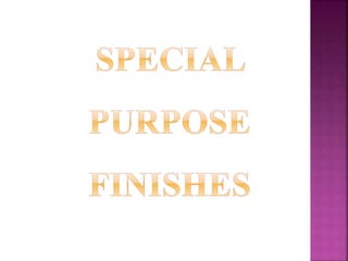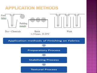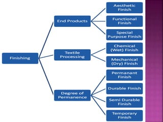 The document discusses various finishing processes and treatments applied to textiles to enhance their appearance, durability, and functionality for end use. It covers types of finishes including aesthetic, performance, and specialized treatments such as waterproofing and fireproofing, as well as techniques like enzyme washing and resin application. Additionally, it highlights advancements in biotechnology and nanotechnology that improve fabric properties while addressing environmental concerns in textile wastewater management.