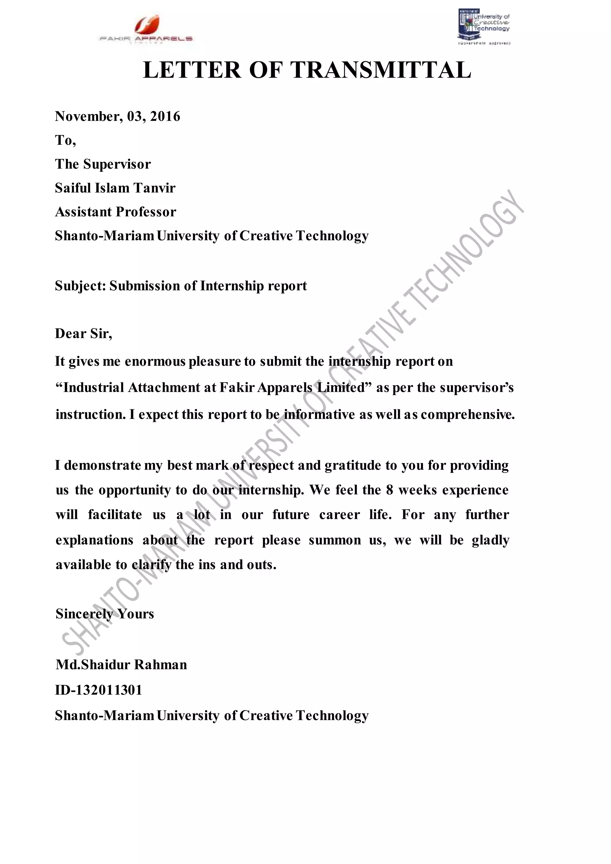 The document is a letter of transmittal from Md. Shaidur Rahman submitting his internship report on Industrial Attachment at Fakir Apparels Limited. It provides an overview of the company's operations, including that it is a composite knit garments manufacturer and exporter with annual turnover of $30 million. It also mentions that the 8-week internship experience will help facilitate their future career.