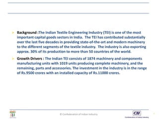 The document discusses the textile machinery, parts, and accessories sector in India. It notes that the sector consists of over 1,874 manufacturing units and has an investment of Rs. 9,500 crores. The key challenges facing the sector include the decentralized nature of the weaving and finishing sectors limiting demand for capital goods. However, opportunities exist to build capacity to meet 60% of domestic demand for textile machinery of all types. The Textile Machinery Manufacturers' Association of India (TMMA) represents over 80-85% of organized sector production capacity and works to promote research and development, exports, and data collection for the industry.