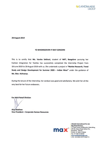 The document is an internship project report by Varsha Sekhani, focusing on market survey and design processes at Max Fashions for the summer 2020 ethnic wear collection. It outlines the company profile, target market, design inspirations, and the practical experiences gained during the project, highlighting the importance of hands-on industry experience. The report emphasizes understanding consumer behavior and market dynamics through direct engagement with the fashion industry.