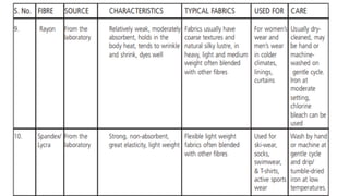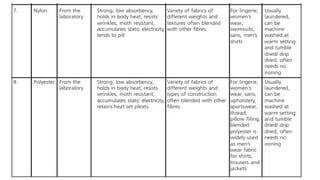 The document outlines a fabric study curriculum for first-year TVET garment students, focusing on fabric types, manufacturing processes, and properties of different fibers. It covers assessments, fabric classifications, the characteristics of various natural and man-made fibers, and the importance of fabric weave patterns. Additionally, it discusses the role of technical textiles, specification details, and the proper handling and pressing of fabrics.