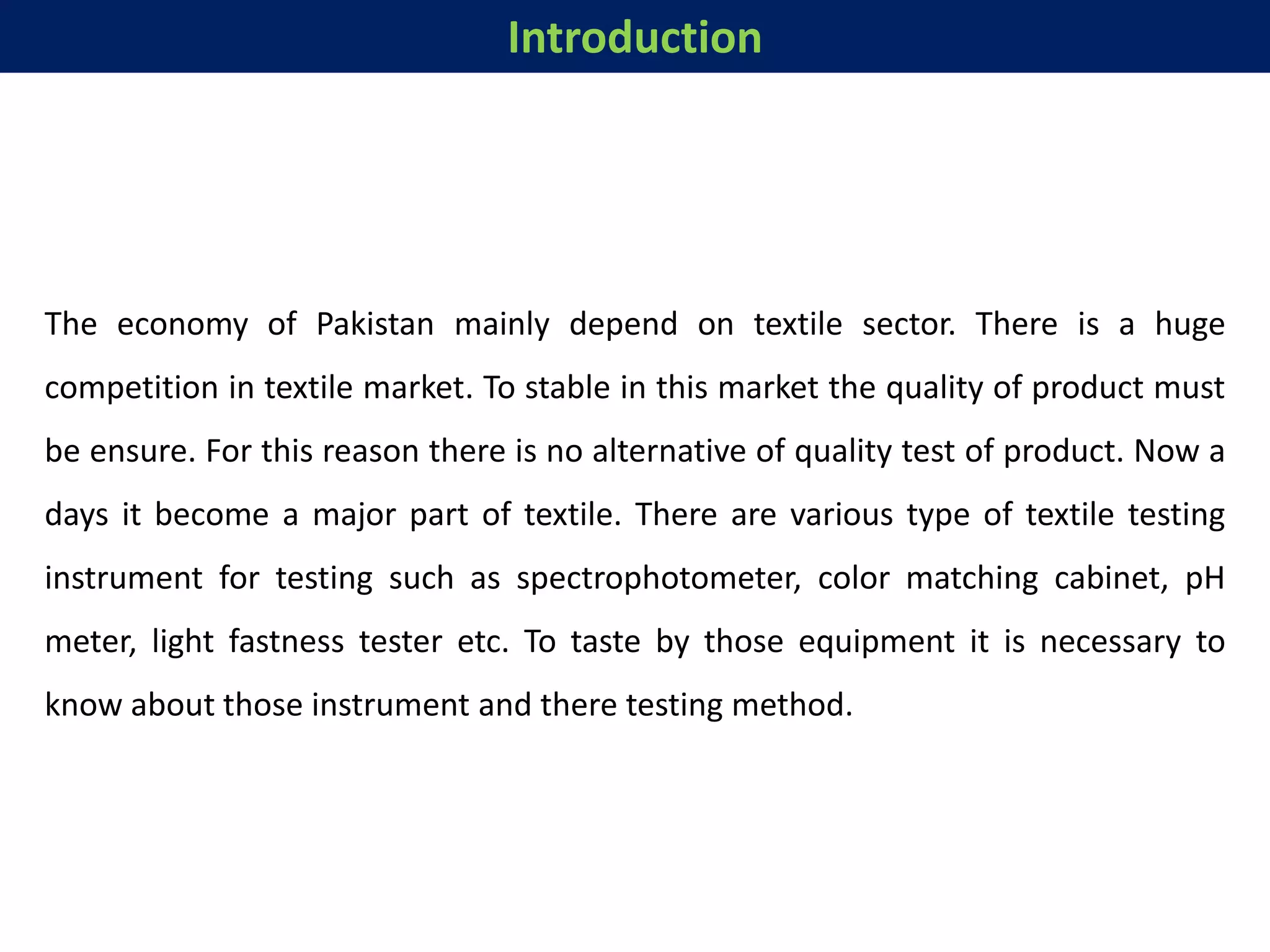 The document discusses various types of textile testing instruments used to test quality at different stages of textile production. It introduces instruments like the GSM cutter, Martindale abrasion and pilling tester, air permeability tester, lea strength tester, Uster evenness tester, wrinkle recovery tester, crease recovery tester, yarn count tester, yarn twist tester, standards tumble dryer, lab conditioner, fabric thickness gauge, yarn strength tester, and tearing strength tester. It provides details on how each instrument works and the procedures to test quality parameters like weight, abrasion resistance, air permeability, strength, evenness, wrinkle recovery, thickness, and tearing strength.