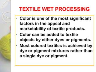 The document covers textile wet processing, focusing on dyeing, printing, and various traditional techniques like batik, kalamkari, tie and dye, and patola. It details the processes involved in applying colors to fabrics, the types of dyes used, and different printing methods, emphasizing the significance of color in textiles. It also contrasts dyeing and printing, highlighting their methods, applications, and requirements.