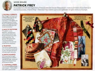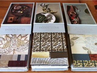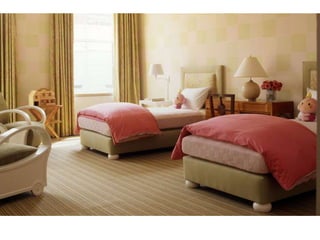 This document discusses various uses of textiles in interior design. It mentions that interior designers use textiles to add color, texture, and other elements to a space. It also lists different properties that are important for various interior end uses, such as dimensional stability for wall fabrics, abrasion resistance and strength for upholstery, and resilience for carpets. The document notes that textiles are used for upholstery, contract upholstery, panel fabrics, upholstered walls, windows, privacy curtains, bedding, trimming, and rugs.