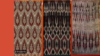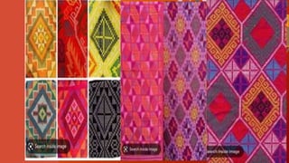 The document discusses the arts and crafts of various ethnolinguistic groups in Mindanao, Philippines. It describes their traditional textiles, attire, and weaving/embroidery techniques. The B'laan are known for embroidery and beadwork integrated into clothes woven from abaca. The Bagobo and T'boli create sacred t'nalak cloth in red, brown, and black colors. The Maranao are renowned for their malong skirts that can be worn and used in many ways, as shown in the Kapa Malong Malong dance. The Yakan are recognized for their boldly patterned hand-loomed fabrics used for garments like the seputangan head cover