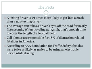 Texting while driving greatly increases the risk of crashes, as it takes a driver's eyes off the road for about 5 seconds on average - enough time to cover a football field when driving 55mph. Cell phones are responsible for 18% of distraction-related fatalities in the US, and females are twice as likely as males to use electronic devices while driving. Distracted driving is a serious problem, claiming over 3,000 lives in 2012 alone, with those under 20 and texting drivers being especially at risk of crashes due to lack of attention on the road.