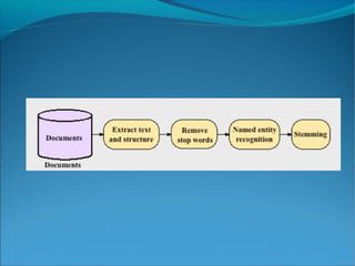 The document discusses text mining, including defining it as the extraction of information from unstructured text using computational methods. It covers topics such as structured vs unstructured data, common text mining practice areas like information retrieval and document clustering, and challenges in text mining including ambiguity in language. Pre-processing techniques for text mining are also outlined, such as normalization, tokenization, stemming and removing stop words to clean and prepare text for analysis.