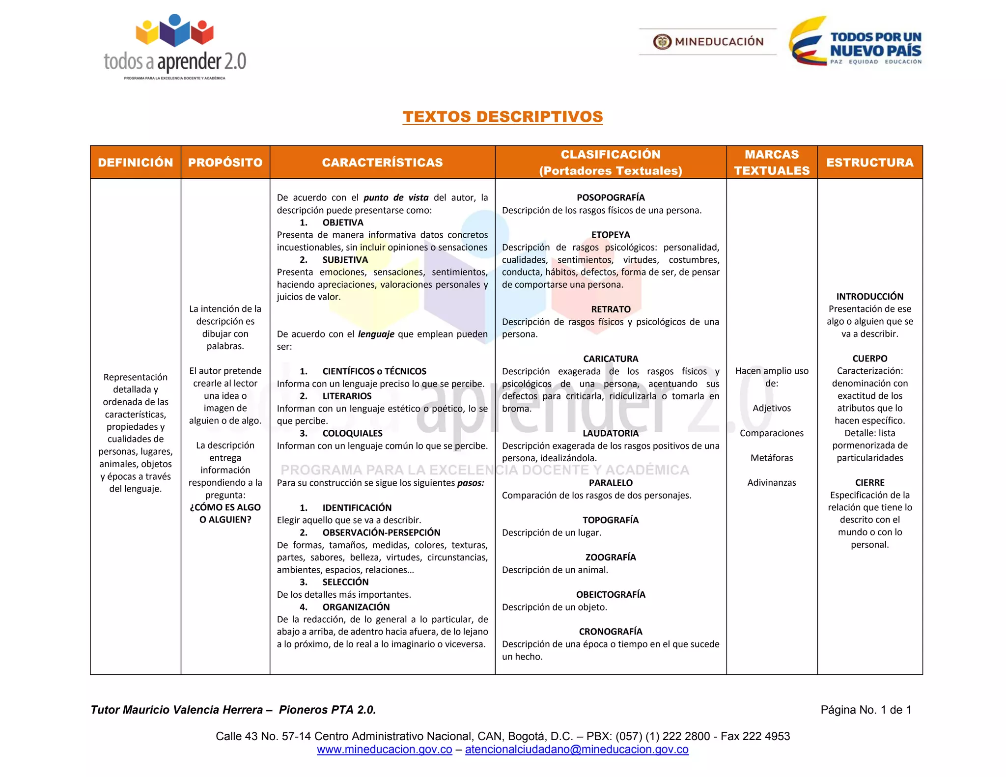 Este documento define la descripción como una representación detallada y ordenada de personas, lugares u objetos a través del lenguaje con el propósito de crear una imagen en el lector. Explica que las descripciones pueden ser objetivas o subjetivas dependiendo del punto de vista del autor, y que utilizan adjetivos, comparaciones y otras figuras literarias. Además, clasifica diferentes tipos de descripciones como retratos, caricaturas, topografías y más, y establece que su estructura típica incluye una introducción, cuerpo