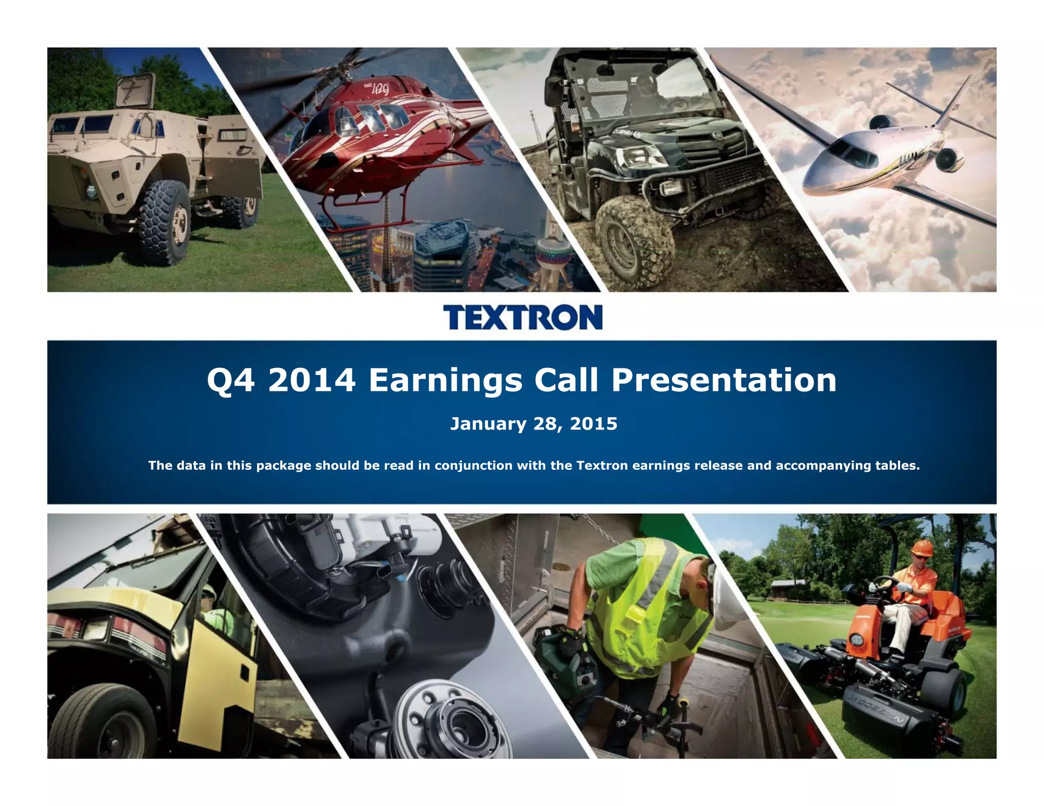 This document summarizes Textron's Q4 2014 earnings call presentation. Key points include: Revenues for Q4 2014 were $4.1 billion compared to $3.5 billion for Q4 2013. Full year 2014 revenues were $13.9 billion compared to $12.1 billion for full year 2013. The outlook for 2015 estimates EPS from continuing operations of $2.30 to $2.50 compared to $2.15 for 2014, and manufacturing cash flow before pension contributions of $550 million to $650 million compared to $753 million for 2014. Segment revenue and profitability expectations for 2015 are provided for Textron Aviation, Bell, Textron Systems, Industrial, and Finance.