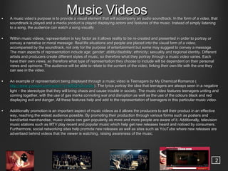 The document provides an analysis of the music video for "Hey There Delilah" by The Plain White T's. The video tells the story of a long-distance relationship between a male singer and his girlfriend Delilah. It uses locations, costumes, and lighting to portray the sadness and loneliness experienced by both characters due to the geographical separation. The video also reflects the themes of the song, which expresses optimism that the relationship will endure despite current challenges. Overall, the video utilizes common narrative, technical, and aesthetic techniques to visually represent and promote the song's message.