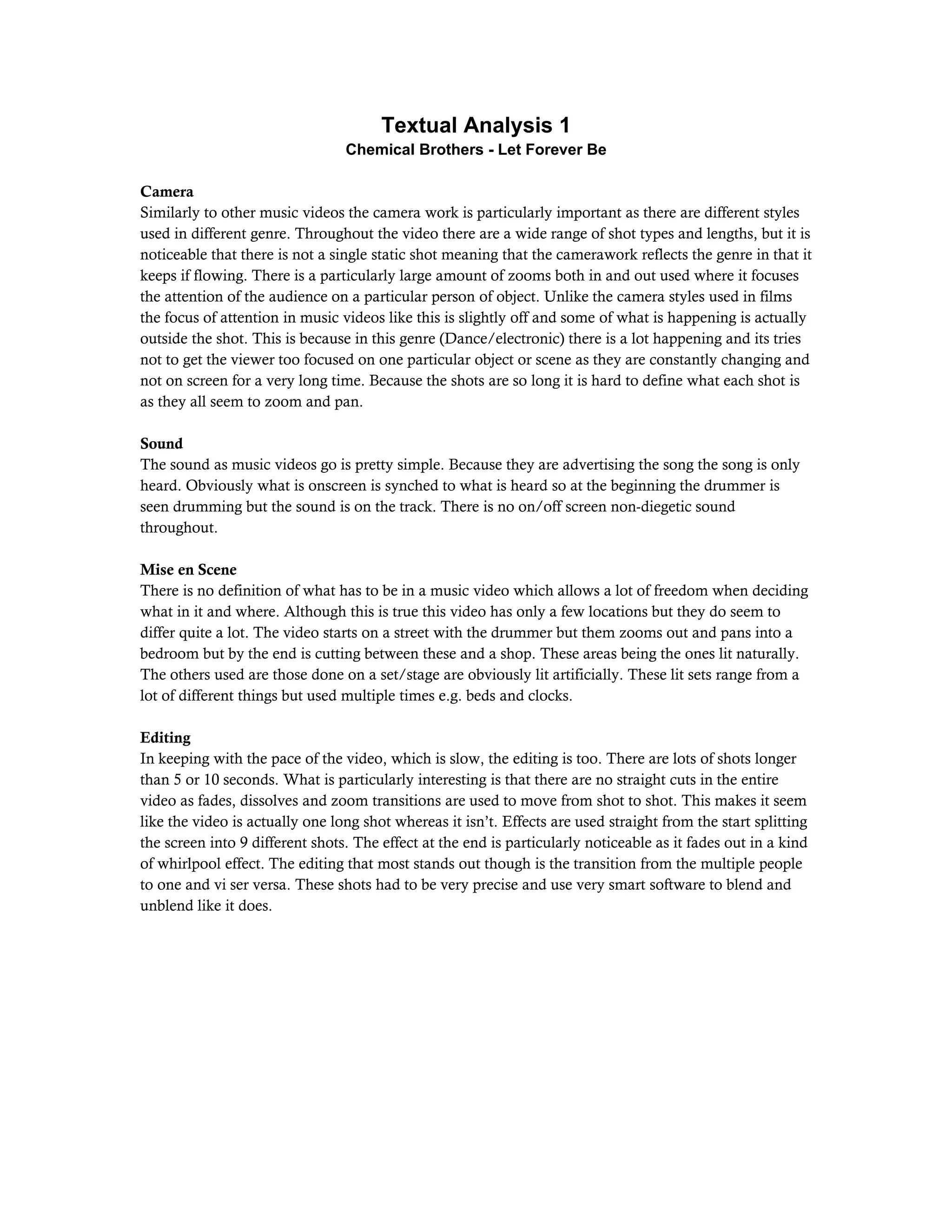 The video uses a wide range of camera shots and techniques to keep the viewer engaged, including many zooms to focus on specific objects. While the shots last a long time, the camera is always moving to reflect the fast-paced electronic music genre. The sound is simply the song itself, with no additional non-diegetic effects. A variety of indoor and outdoor sets are used, ranging from natural to artificially-lit locations like beds and clocks. Transitions between shots are always smooth fades, dissolves or zooms to give the impression of one continuous shot, keeping pace with the slow song.