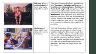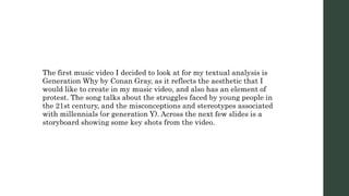 This document summarizes and analyzes the music video "Generation Why" by Conan Gray. It discusses how the video reflects the aesthetic and message of protest that the author wants to portray in their own music video. It highlights how the video depicts the struggles of young people today and stereotypes about millennials. The document also praises the continuous color scheme throughout the video that helps different locations flow smoothly, and expresses a desire to incorporate short title sequences at the beginning and end of their own video to bookend it and direct viewers to their website.