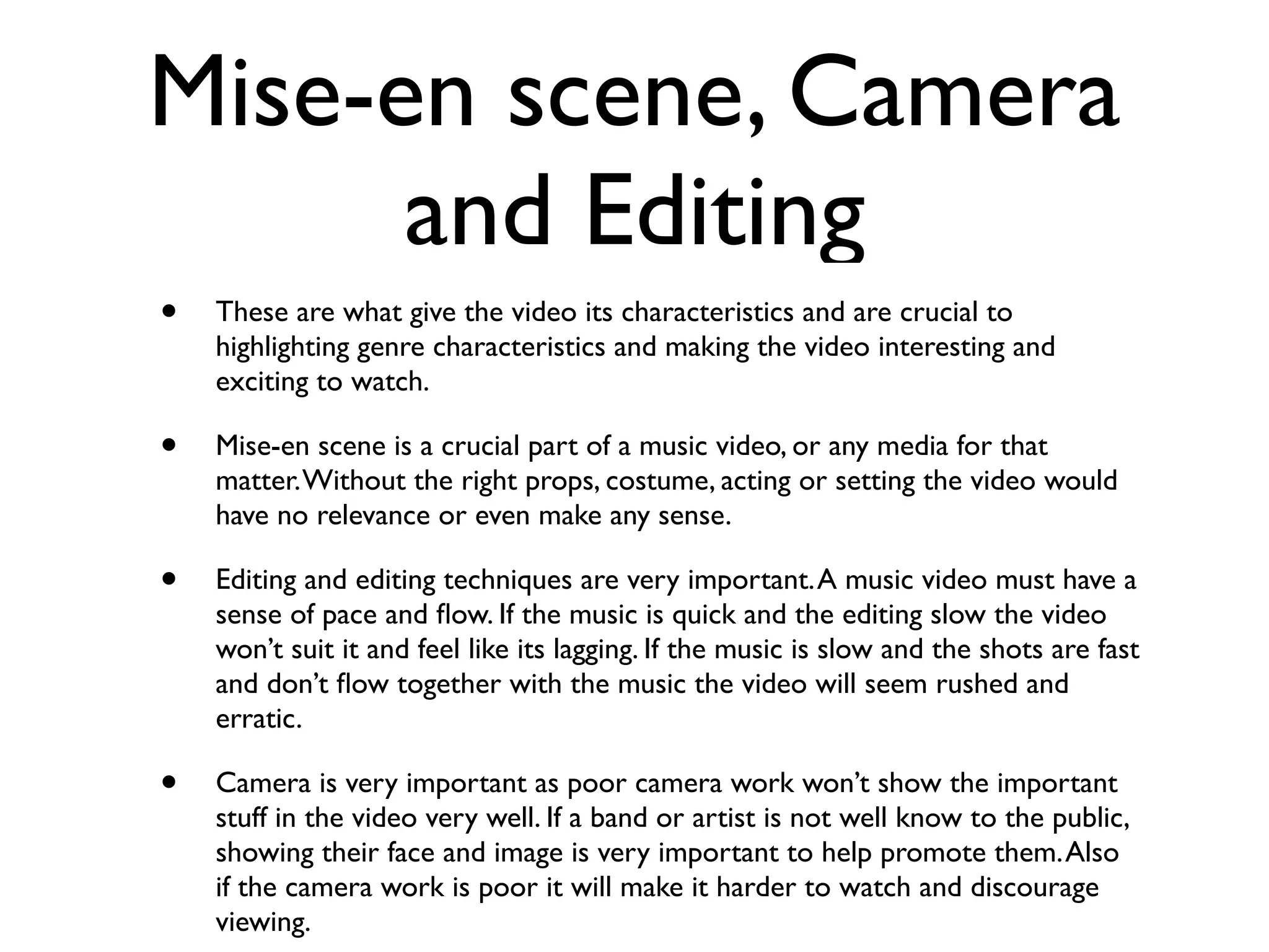 Mise-en-scene, camerawork, and editing are crucial elements that give a music video its characteristics and make it interesting to watch. Mise-en-scene provides the proper setting, props, costumes, and acting. Careful editing ensures the video has a sense of pace and flow that matches the music. Skillful camerawork clearly shows important elements and promotes unknown artists. An effective music video demonstrates the genre's traits and links its visuals and lyrics to the song's music and message.