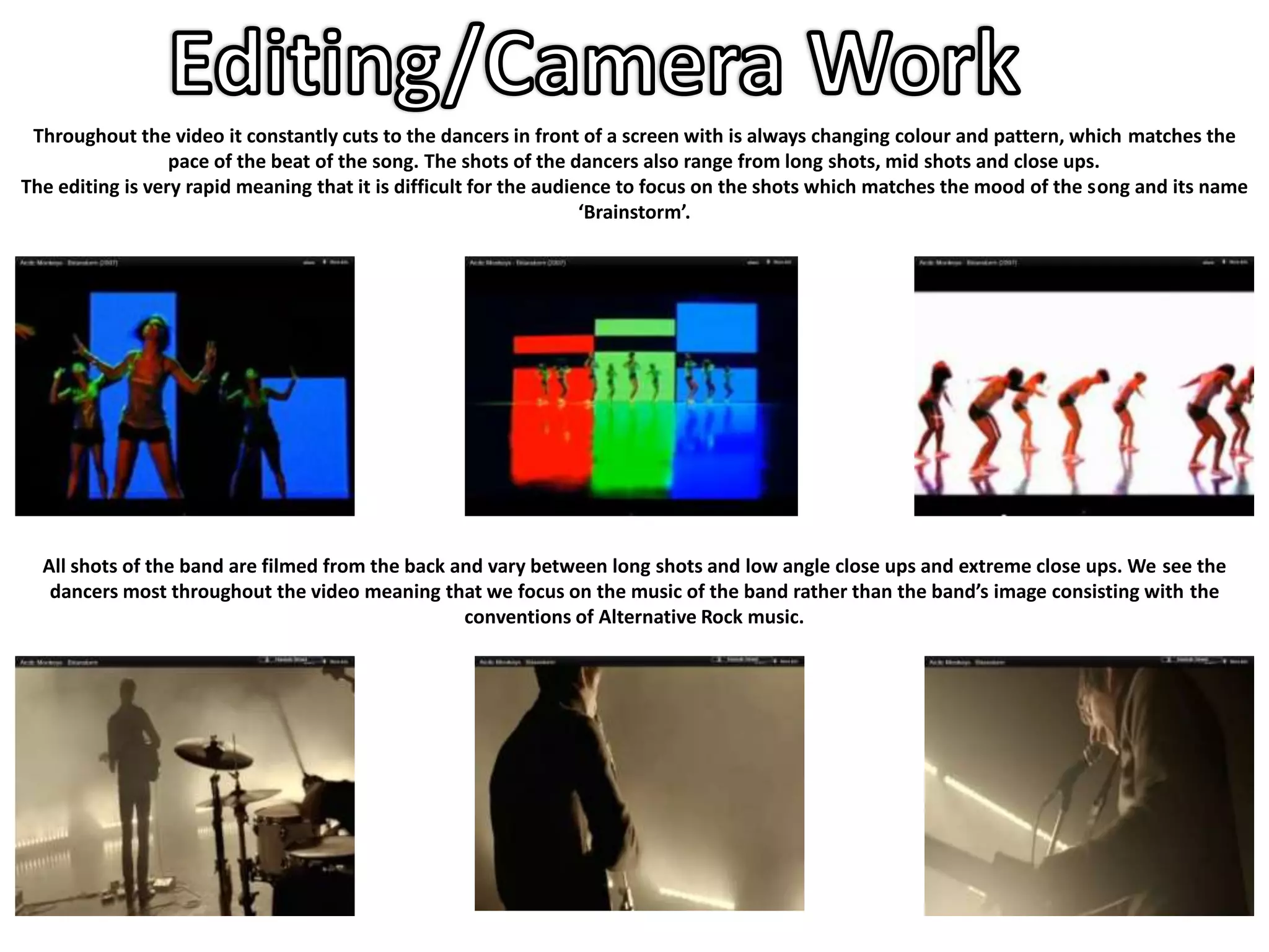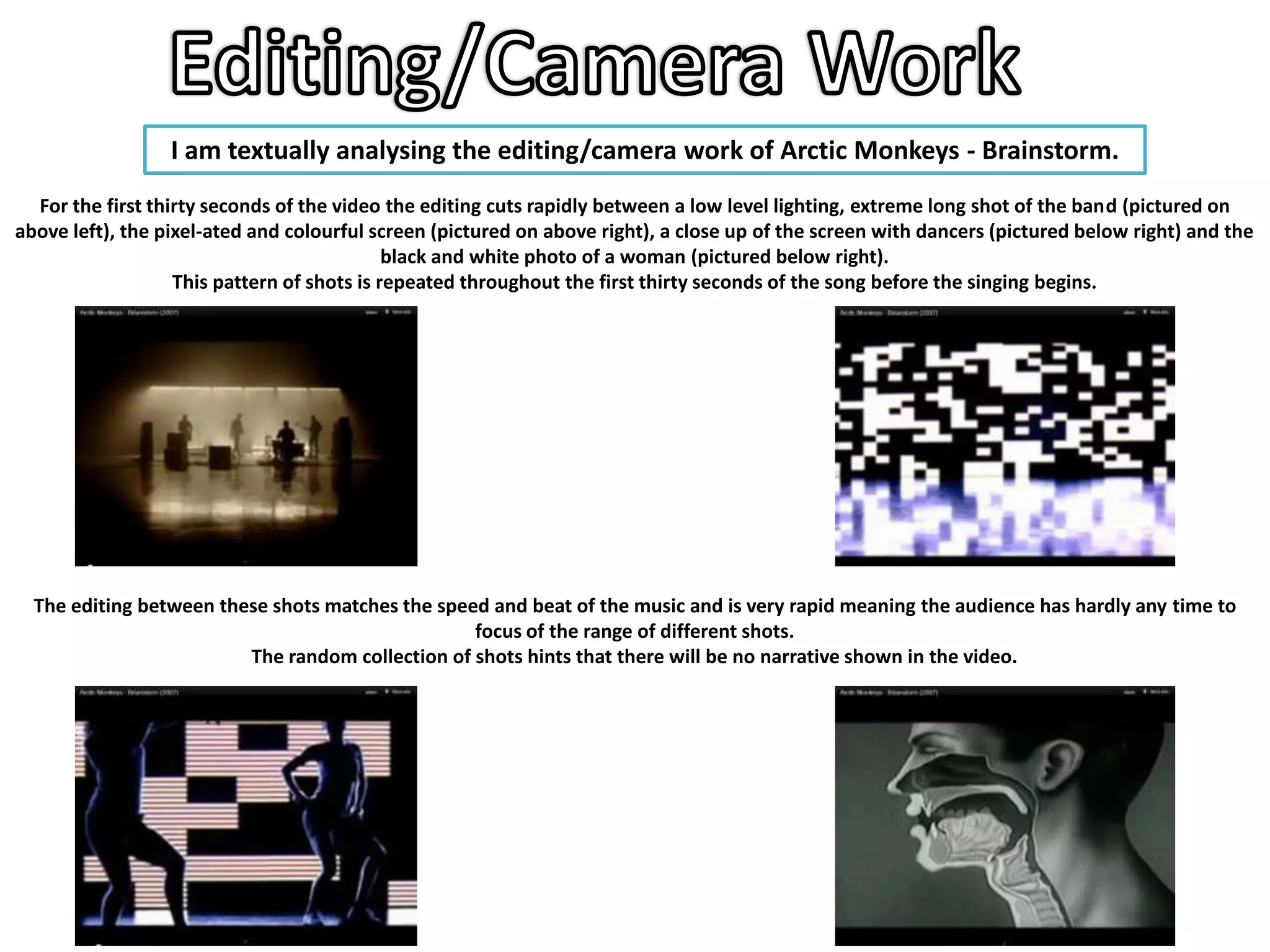 The editing in the Arctic Monkeys - Brainstorm music video cuts rapidly between shots of the band, a pixelated screen with dancers, and black and white photos within the first 30 seconds. This pattern repeats throughout to match the speed and beat of the song. The random collection of shots and focus on the changing color screen and dancers instead of the band suggests there is no narrative and focuses on the music.