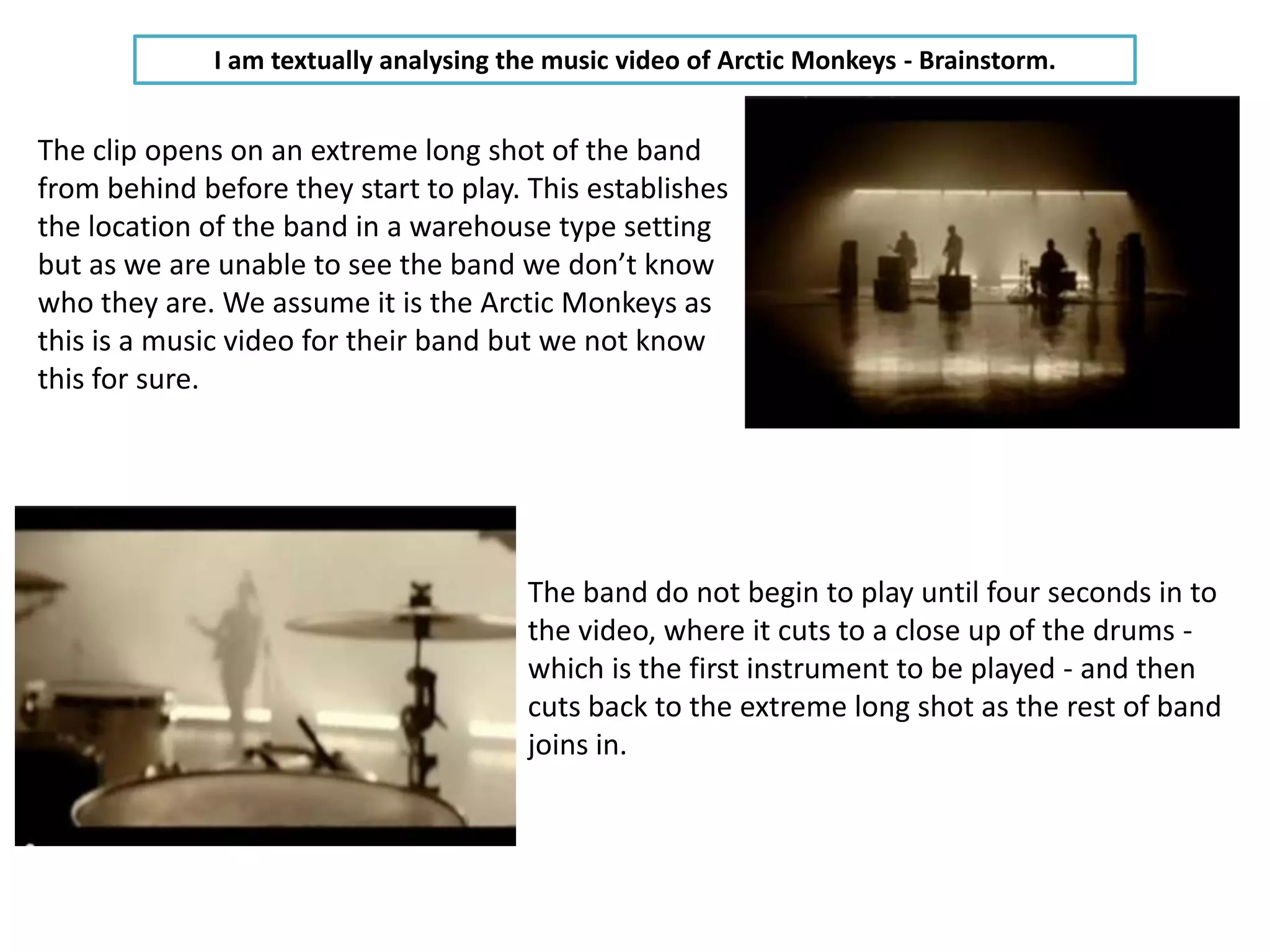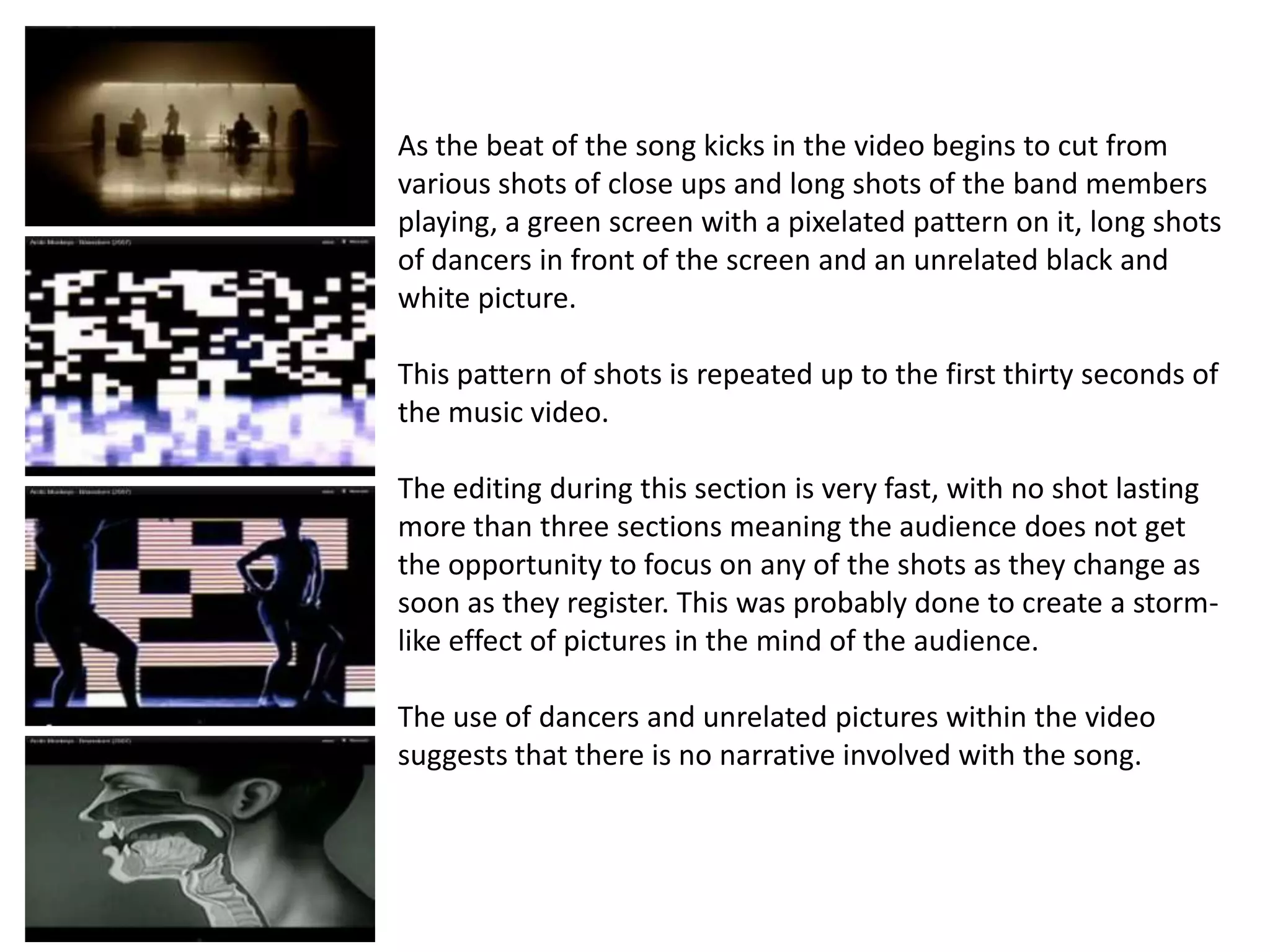 The music video for Arctic Monkeys' "Brainstorm" opens with an extreme long shot of the band from behind in a warehouse setting. The video cuts between close-ups and long shots of the band members playing, a green screen with pixels, shots of dancers, and unrelated black and white pictures. This fast editing creates a "storm-like" effect and suggests there is no narrative. The band wears casual clothes like jeans, giving them a relaxed alternative rock style. While the lead singer is featured most, he is never shown front-on, keeping the focus on the music over the band's image. The increasing pace of the editing matches the mood of the song. The video ends with the lone drum beat and long