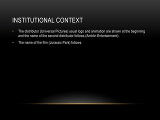 The opening scene of Jurassic Park establishes the film's sci-fi and horror genres. It shows guards unloading a raptor cage where the dinosaur almost escapes by grabbing a man. The powerful game warden Muldoon is shown facing off against the raptor in a shot reverse shot. Despite Muldoon's attempts, the raptor defeats him and kills the man. Camera angles are used to emphasize the imposing raptor and fearful guards. Sound effects of the machinery and dinosaur enhance the tension.