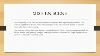 The document provides a textual analysis of a student film called "Black Widow" focusing on its mise-en-scene, sound, editing, and camera work. It notes that the film opens with a character walking down a corridor to add seriousness. The character then enters a small, cramped room showing it is not a typical meeting place. Strange static-like sounds are used throughout for continuity. The film is edited in grey scale to increase mystery. Camera angles start with a close-up of feet walking and tilts up to show a hand opening a door where another person is waiting suspiciously. Extreme close-ups of mouths are used instead of shots and reverse shots to keep identities mysterious.