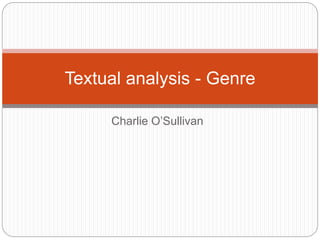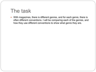 The document compares the conventions used in different magazine genres to identify the genre. It analyzes the covers of a music magazine (Rolling Stone), women's magazine (Glamour), and gaming magazine (PC Gamer). Each magazine establishes its genre through elements like the title, cover image, article topics, and color scheme. For example, Rolling Stone references music through its title and focus on a rapper, while Glamour uses pink colors and a smiling female model to signal its focus on women. Overall, the magazines effectively convey their distinct genres through cover design conventions.