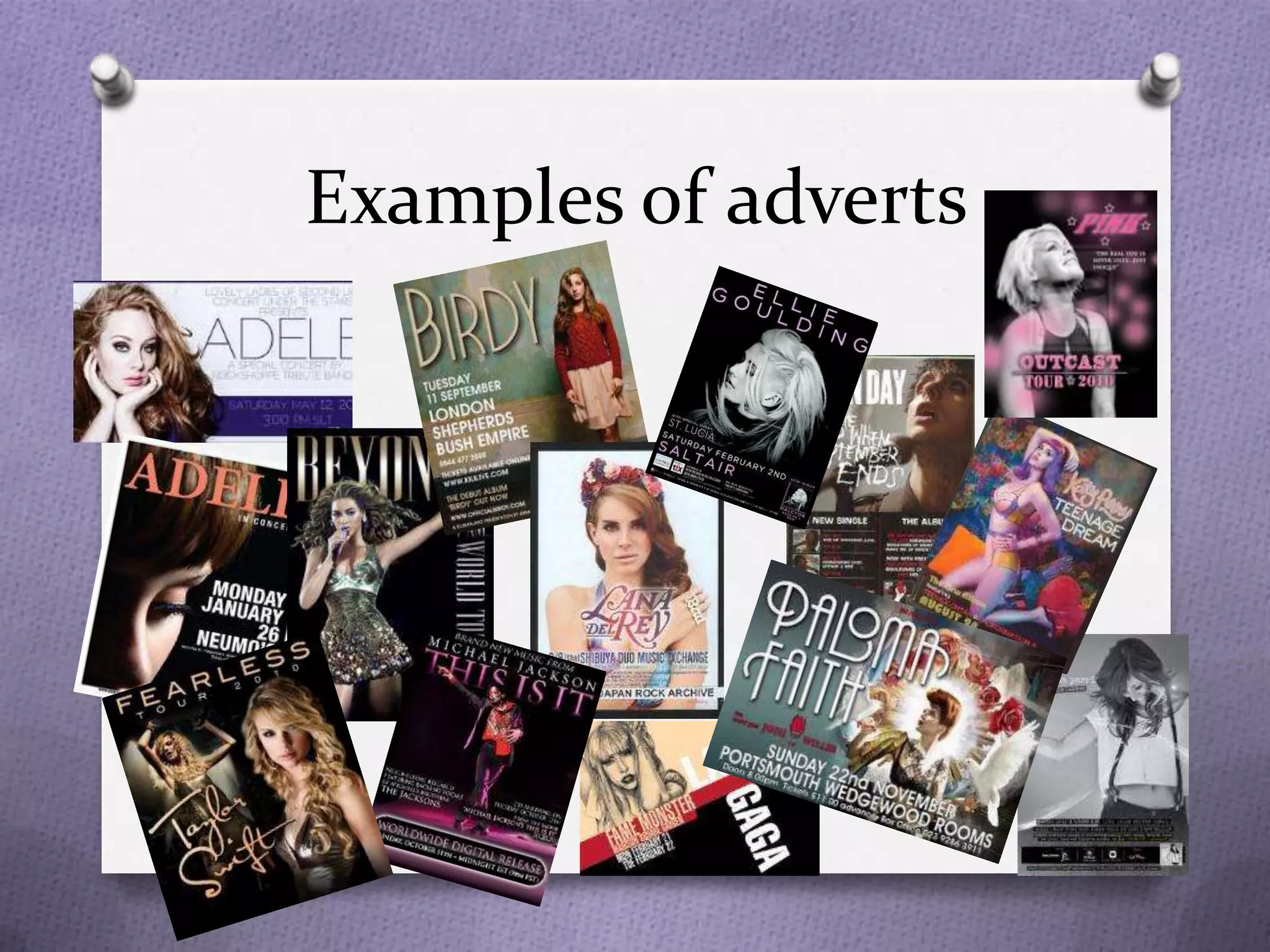 This document contains textual analyses of advertisements for three artists: Christina Perri, Beyoncé, and Michael Jackson. The analyses describe the genres of each artist, examine visual elements of the advertisements like colors and poses, and note unique selling points like "never before released" material. Overall, the analyses consider how the advertisements represent the artists' brands and genres to attract audiences.