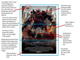- Posters establish eye contact with the audience through direct gaze of central characters. Placement above or to the side of the camera implies wanting to draw the audience in or make them curious.