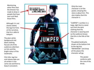 The document provides descriptions of various movie posters, highlighting key design elements and techniques used: