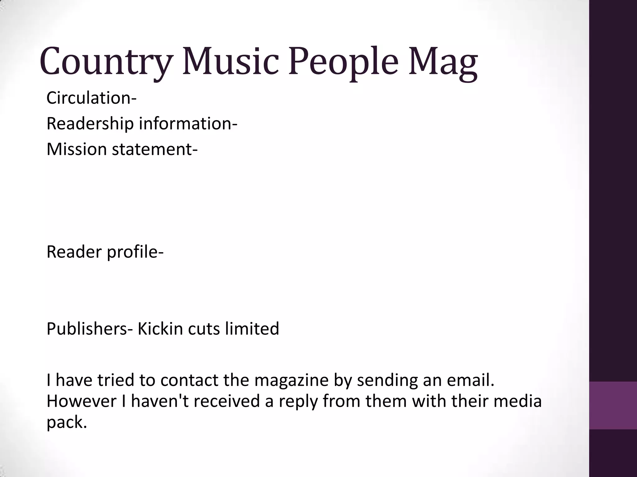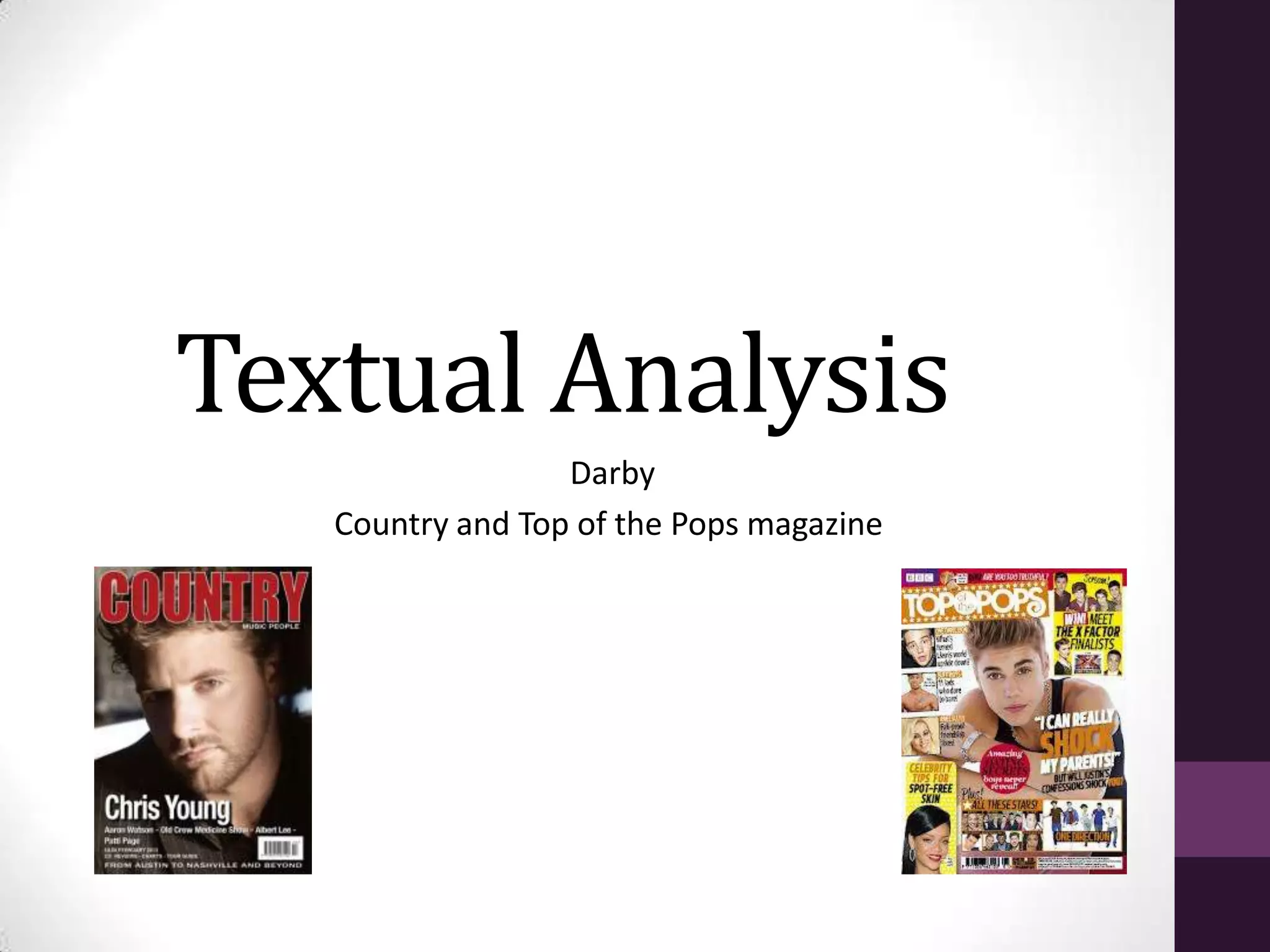The document analyzes two music magazines: Country Music People and Top of the Pops. For Country Music People, it discusses the red masthead color representing passion, the natural colors used, the simple front cover layout, close-up artist image to catch readers' eyes, and lack of connection between double page spread image and text. It also notes the minimal text and language on the front cover and double page spread. For Top of the Pops, it describes the bright, eye-catching colors used on the front cover aimed at male readers, more feminine purple on the contents page, and well-placed smaller double page spread image relating to the text. In general, it finds Country Music People lacks visual interest while Top