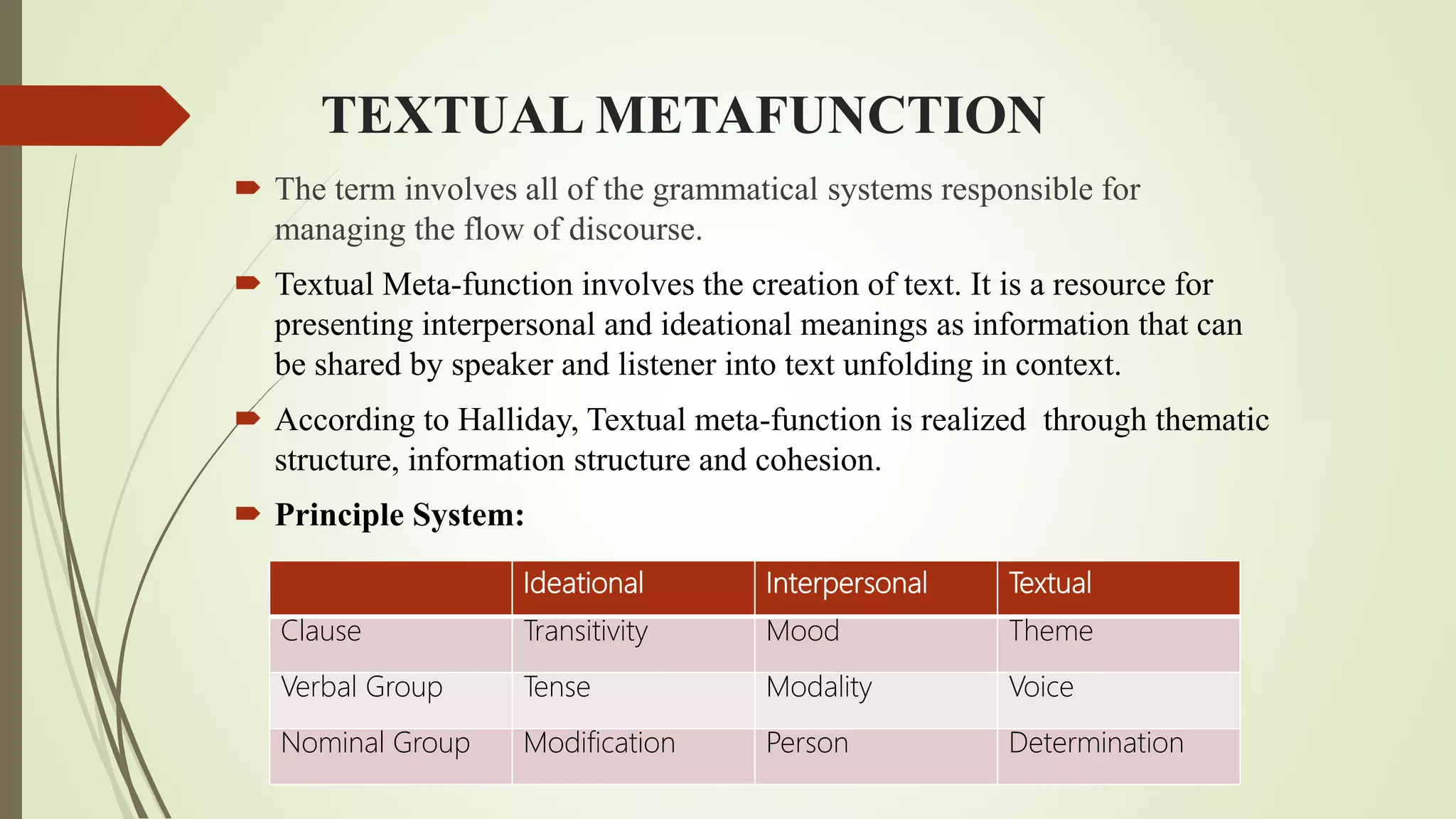 The document discusses systemic functional linguistics, focusing on the textual metafunction, which manages discourse flow through thematic structure, information structure, and cohesion. It elaborates on the concepts of theme and rheme as defined by Halliday, detailing various types of themes and their roles in clauses, including topical, textual, and interpersonal themes. Additionally, it explores how mood influences thematic structure in clauses, illustrating examples of unmarked and marked themes across declarative, interrogative, and imperative moods.