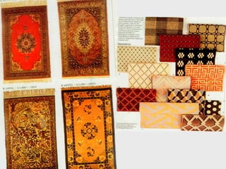 This document discusses texture in design and its visual, tactile, and audible effects. It defines texture as the nature of a surface's feel and appearance. Coarse textures make areas look larger while smooth surfaces seem to advance figures and make colors appear brighter. Texture is considered a design element because it plays a major role through its visual, tactile, and sometimes audible qualities. The document categorizes textures as rough/matt, rough/glossy, smooth/matt, and smooth/glossy and notes the moods each conveys. It also contrasts texture properties like smooth and rough, glossy and matt, limp and crisp.