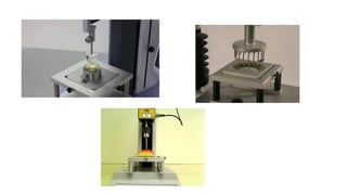 1. A texture analyzer uses controlled deformation of food samples and force measurements to determine textural properties that correlate to sensory attributes. It can perform tests like penetration, compression, cutting, and extrusion that mimic human interactions with food.