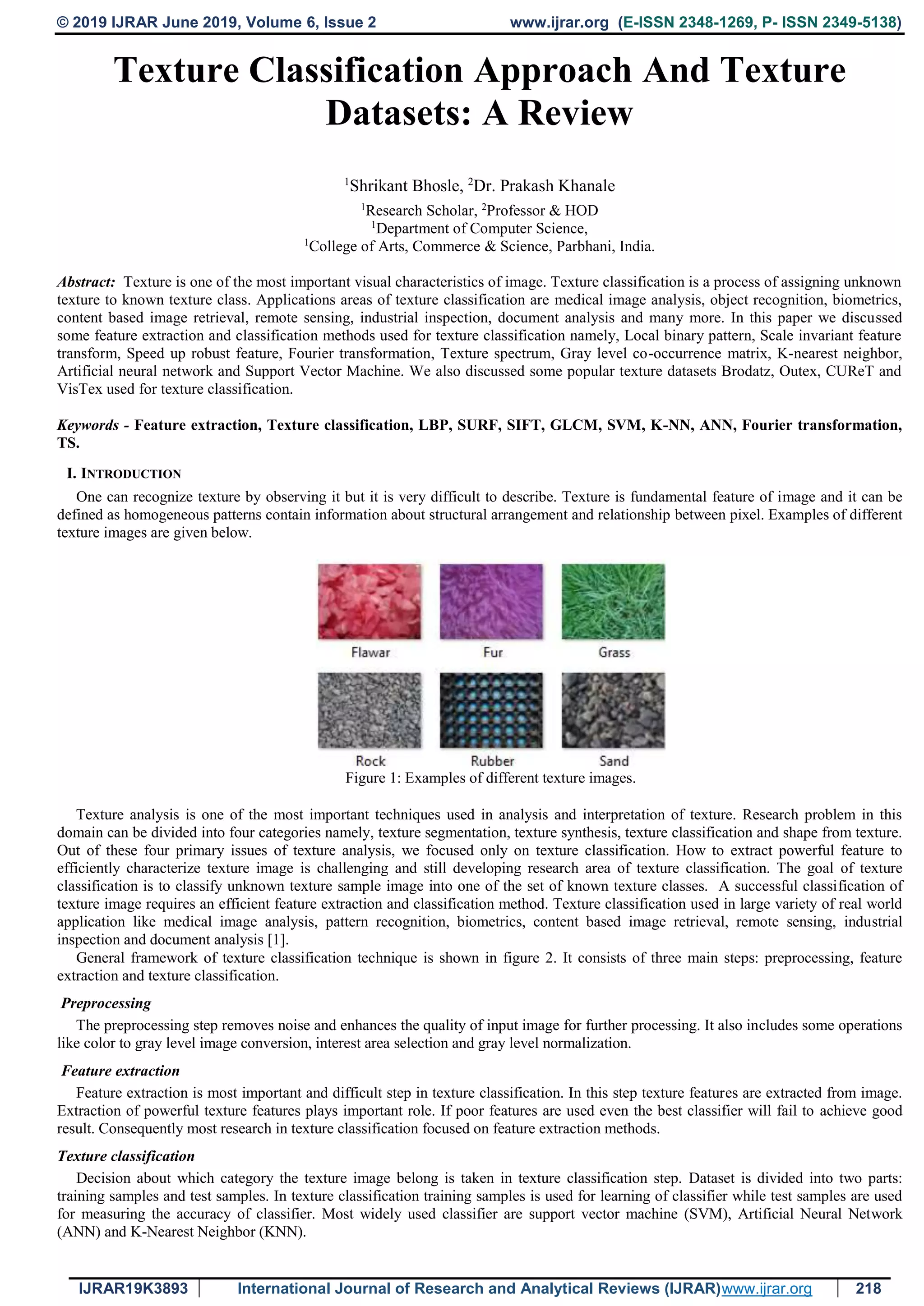 This document provides a review of various texture classification approaches and texture datasets. It begins with an introduction to texture classification and its general framework. Key steps in texture classification are preprocessing, feature extraction, and classification. The document then discusses several common feature extraction methods used in texture classification, including local binary pattern (LBP), scale invariant feature transform (SIFT), speeded up robust features (SURF), Fourier transformation, texture spectrum, and gray level co-occurrence matrix (GLCM). It also reviews three popular classifiers for texture classification: K-nearest neighbors (K-NN), artificial neural network (ANN), and support vector machine (SVM). Finally, it mentions several popular texture datasets that are commonly used for training and testing texture