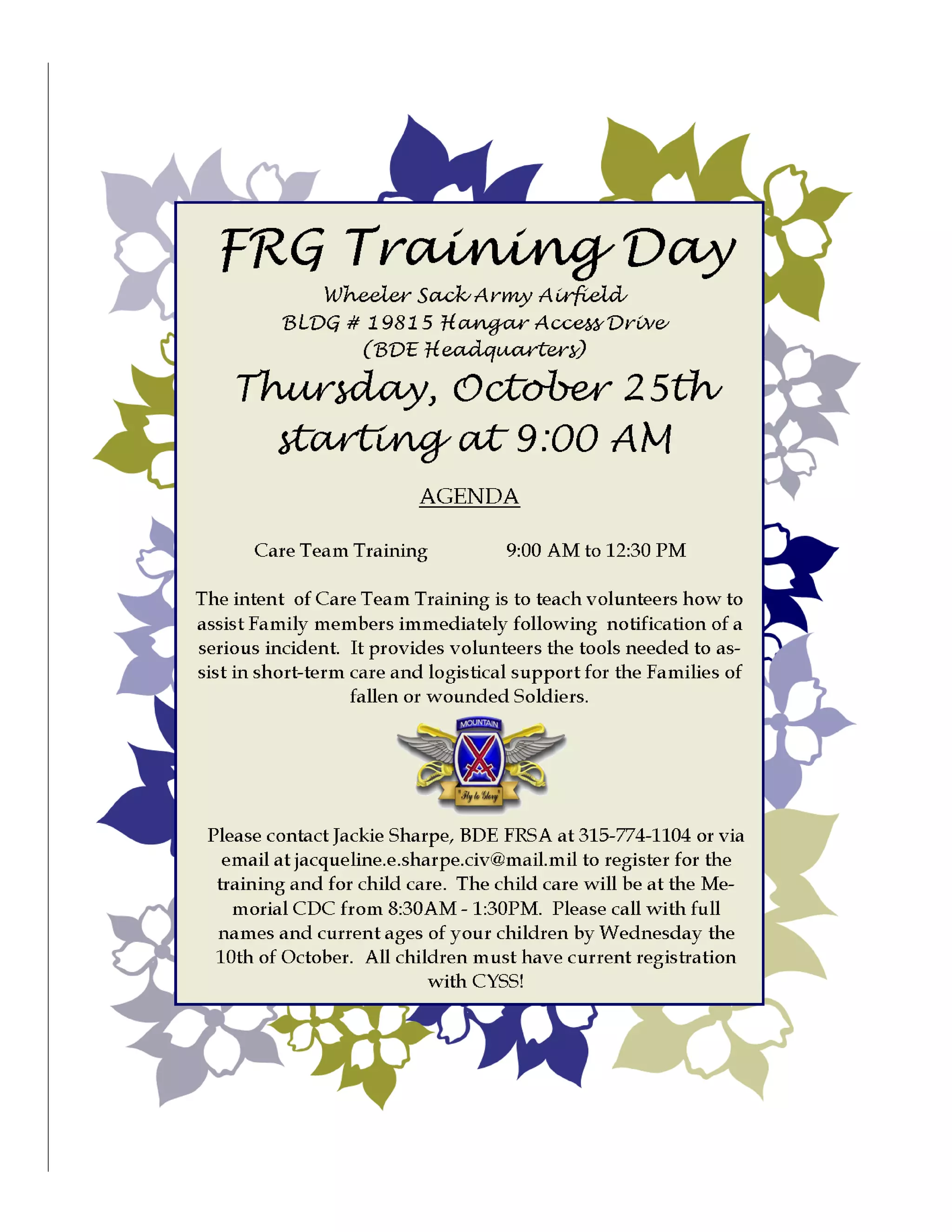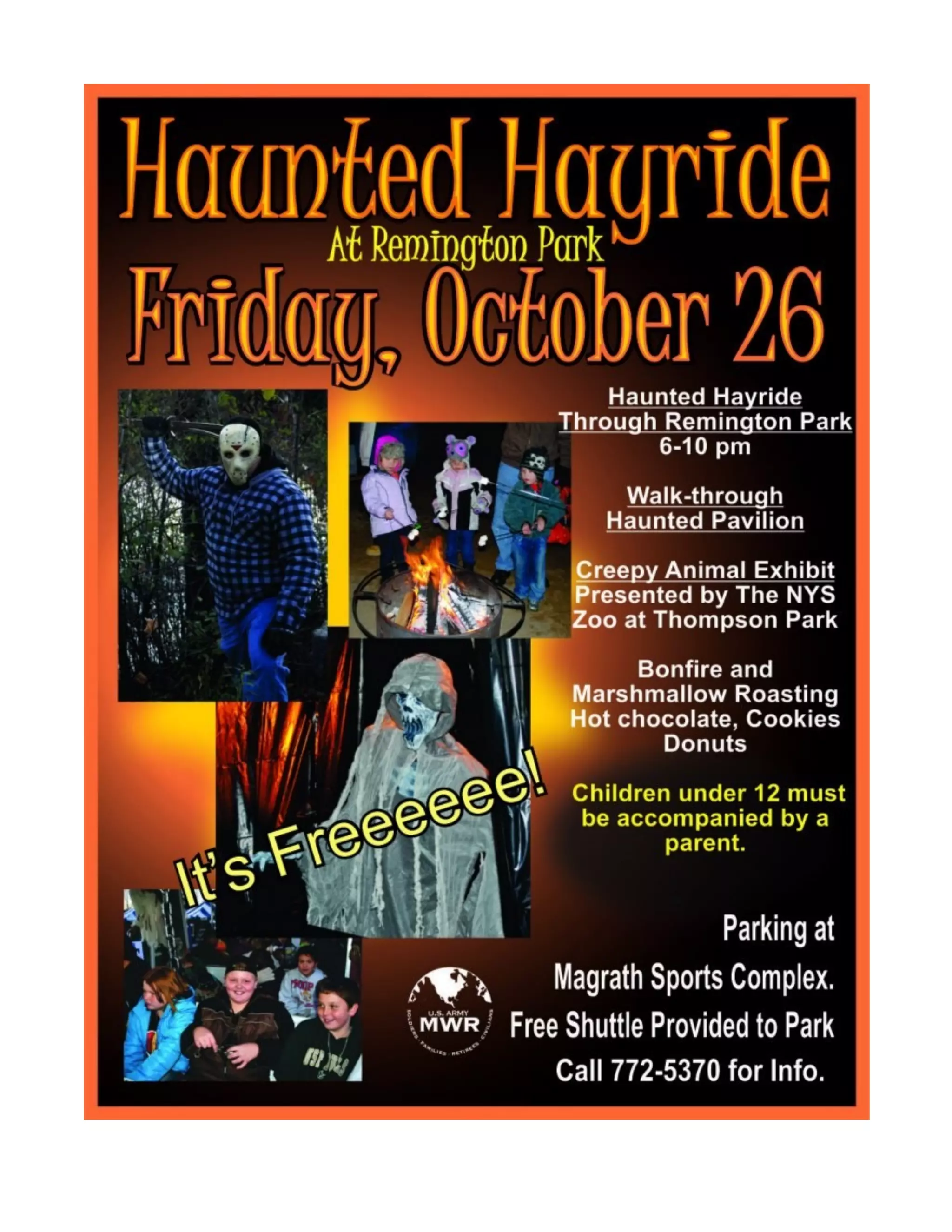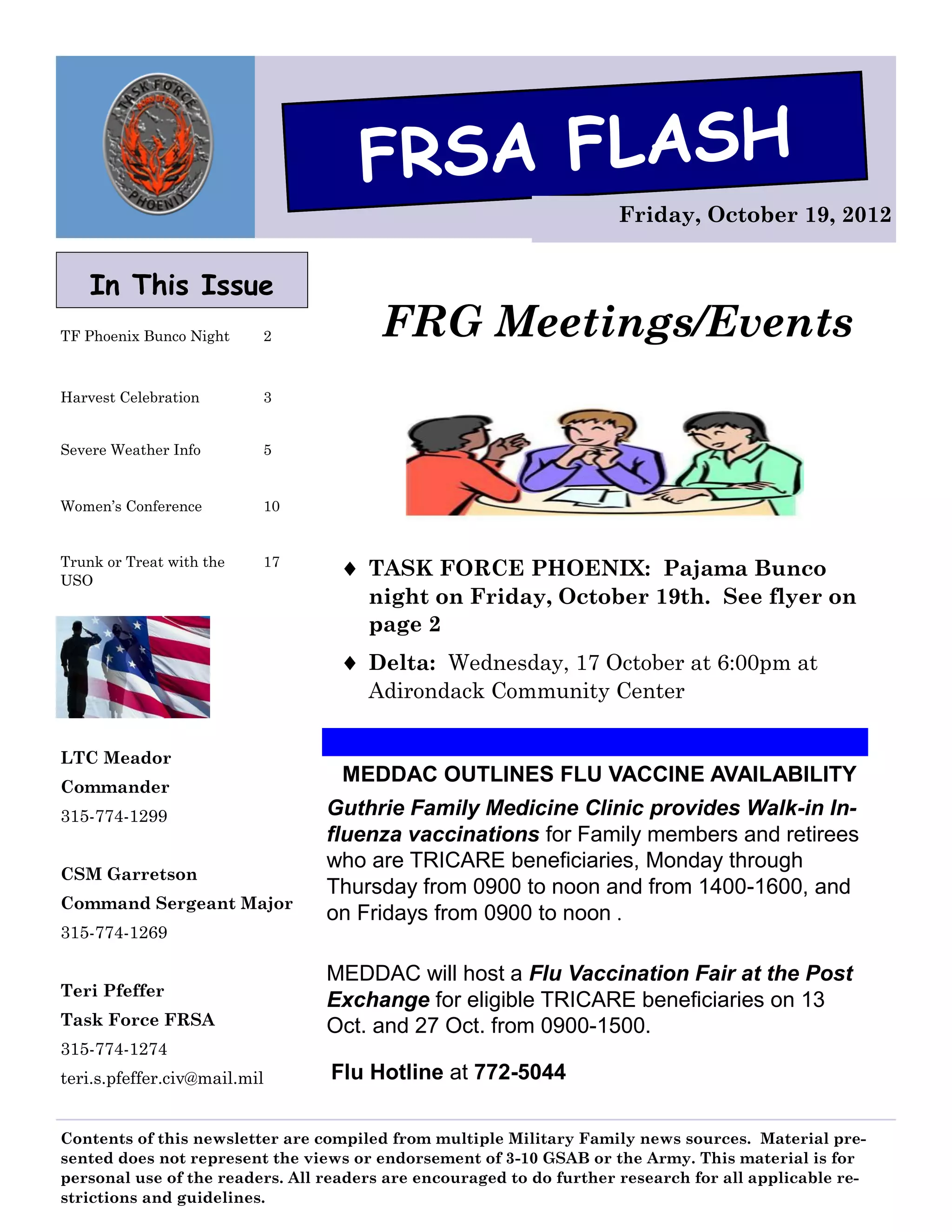 This document provides information about upcoming family readiness group events on Fort Drum including a pajama bunco night on October 19th and an FRG meeting for Delta Company on October 17th. It also provides details about flu shot availability at the Guthrie Family Medicine Clinic and upcoming flu vaccination fairs on October 13th and 27th. Finally, it advertises a haunted hotel event on October 27th hosted by 2nd Brigade featuring haunted tours and activities for different age groups.