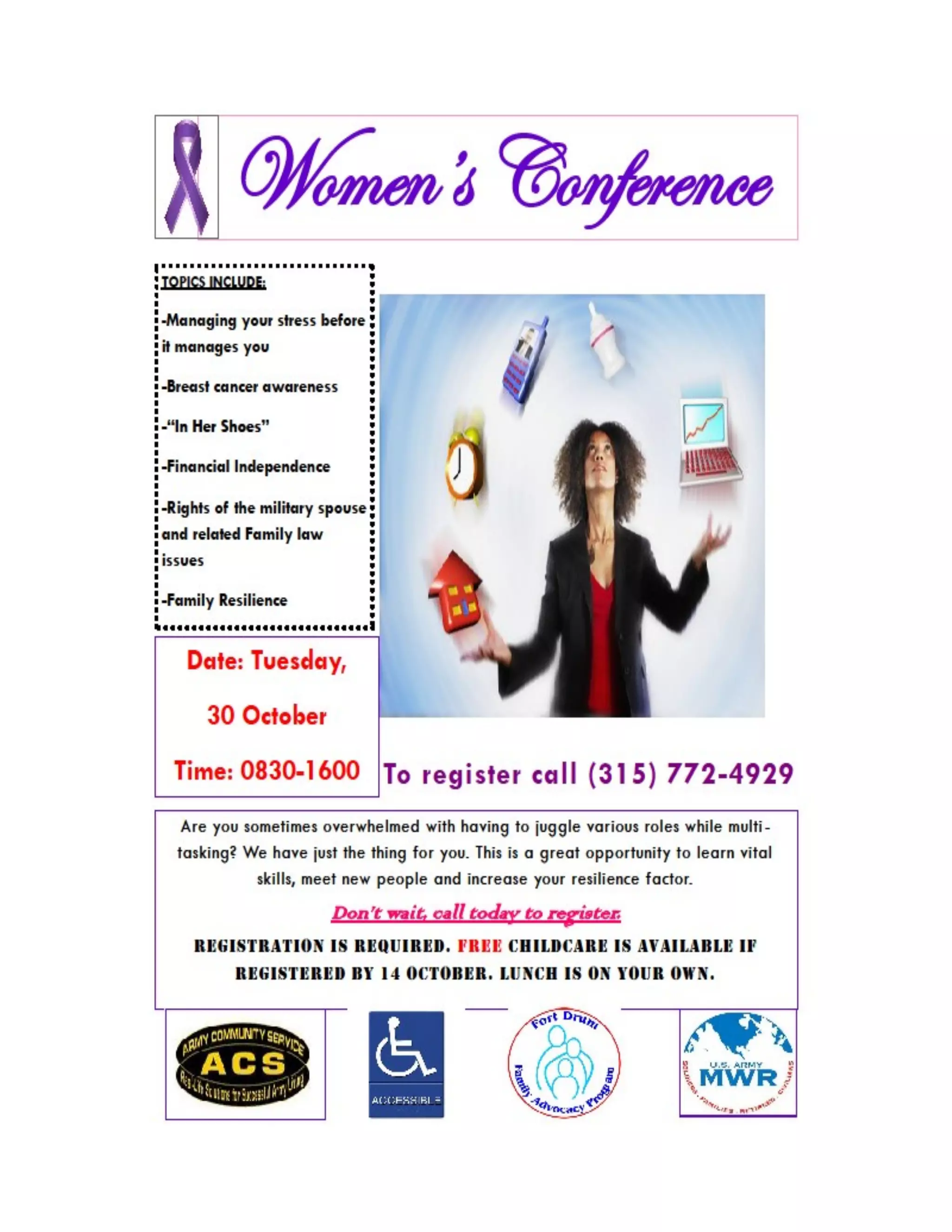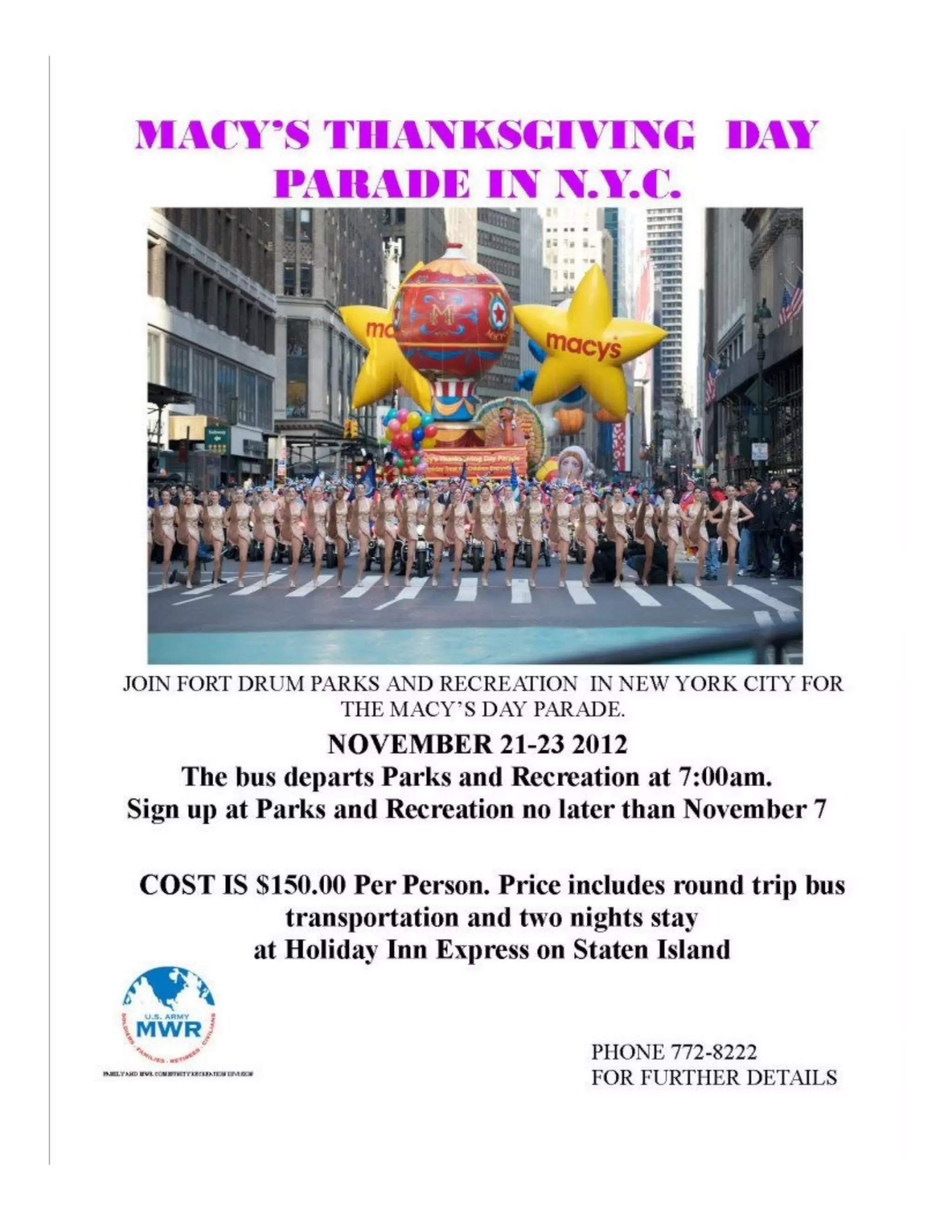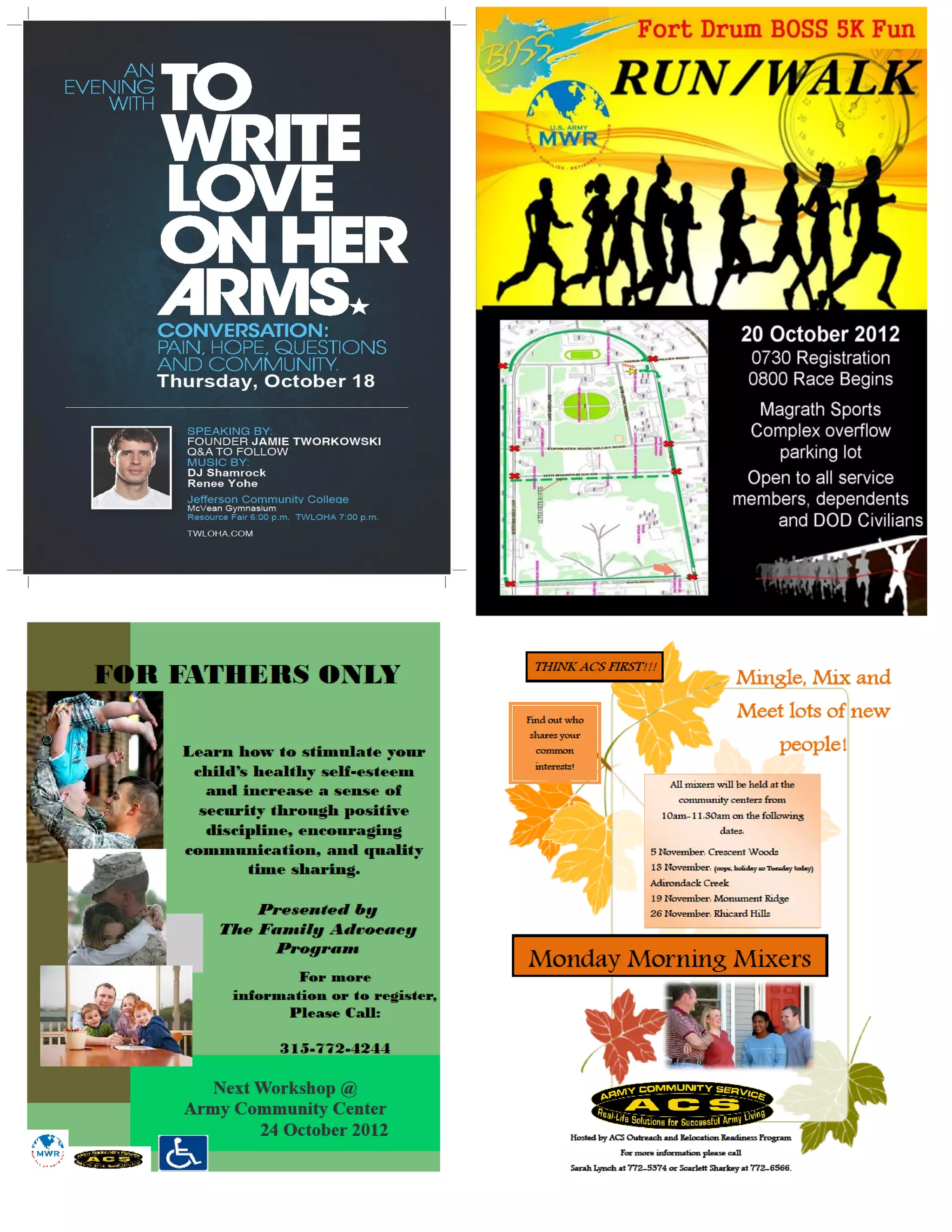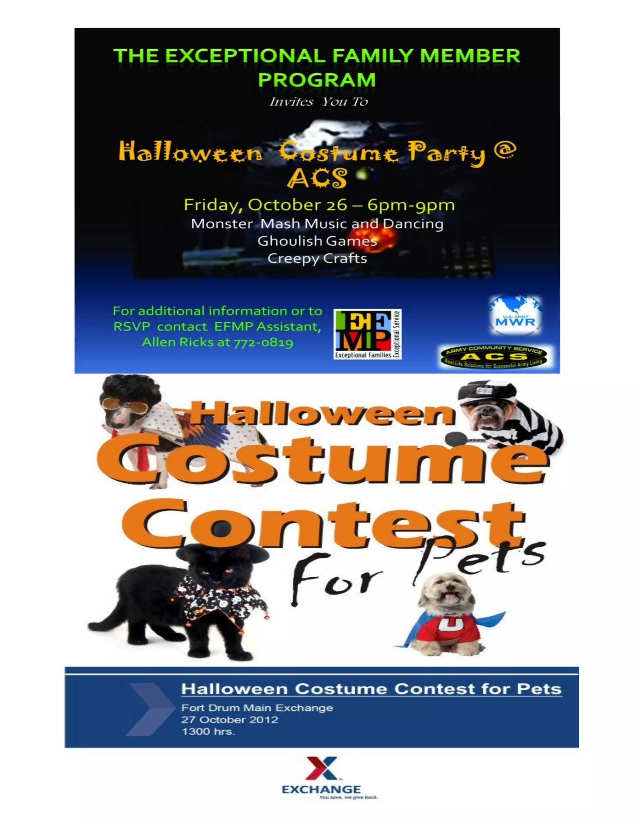 This document provides information about upcoming family readiness group events on Fort Drum including a pajama bunco night on October 19th and an FRG meeting for Delta Company on October 17th. It also provides details about flu shot availability at the Guthrie Family Medicine Clinic and upcoming flu vaccination fairs on October 13th and 27th. Finally, it advertises a haunted hotel event on October 27th hosted by 2nd Brigade featuring haunted tours and activities for different age groups.