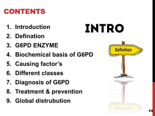 Glucose-6-phosphate dehydrogenase (G6PD) deficiency is a genetic disorder characterized by low levels of the G6PD enzyme. G6PD is involved in processing carbohydrates and protecting red blood cells from oxidative damage. Those with G6PD deficiency are at risk of hemolytic anemia when exposed to certain drugs and foods that cause oxidative stress. The deficiency has different classes of severity based on residual enzyme activity. Diagnosis involves testing for G6PD enzymatic activity and identifying gene mutations. Treatment focuses on managing anemia, while prevention involves avoiding triggers like certain drugs. The condition has a global distribution and mainly affects red blood cells.