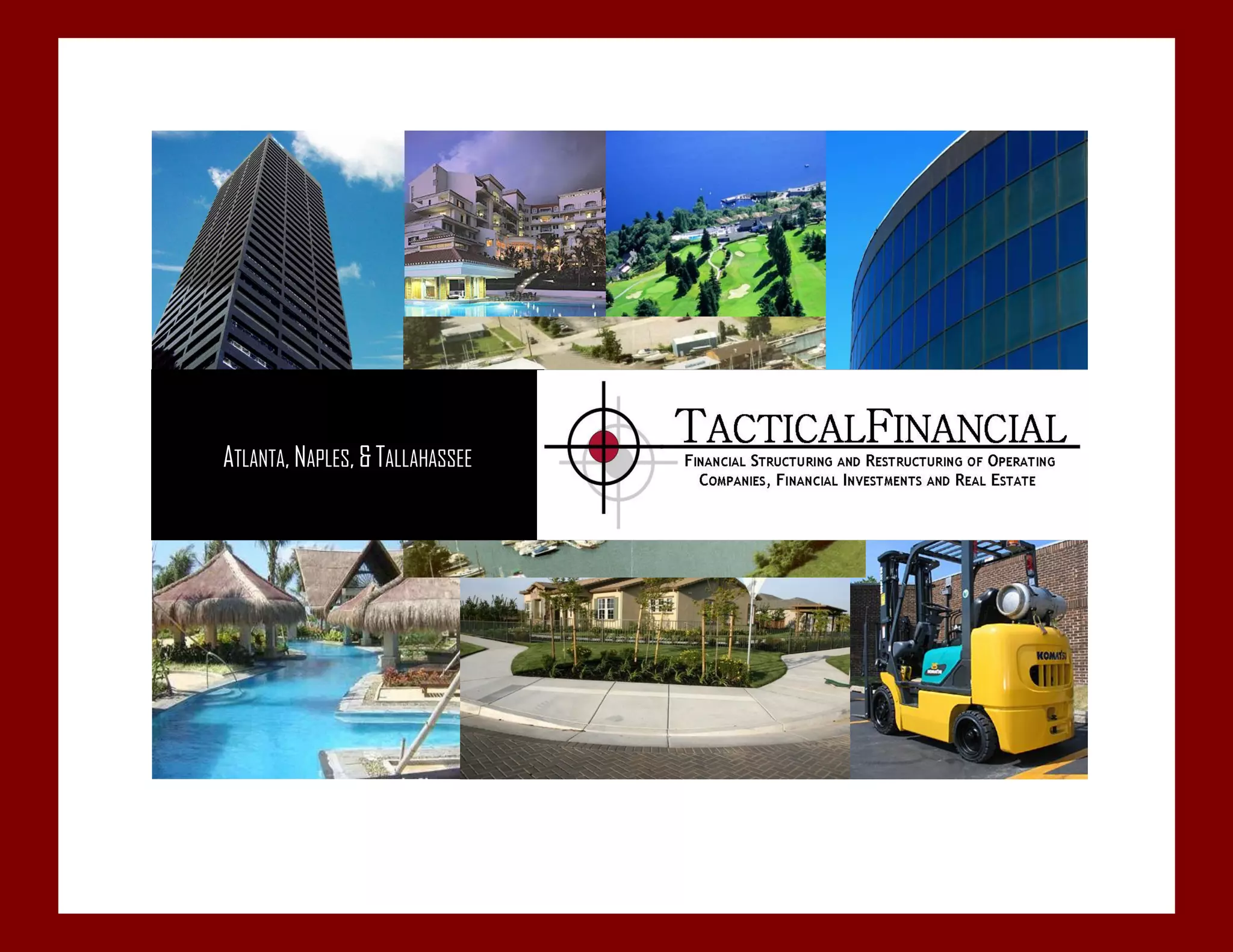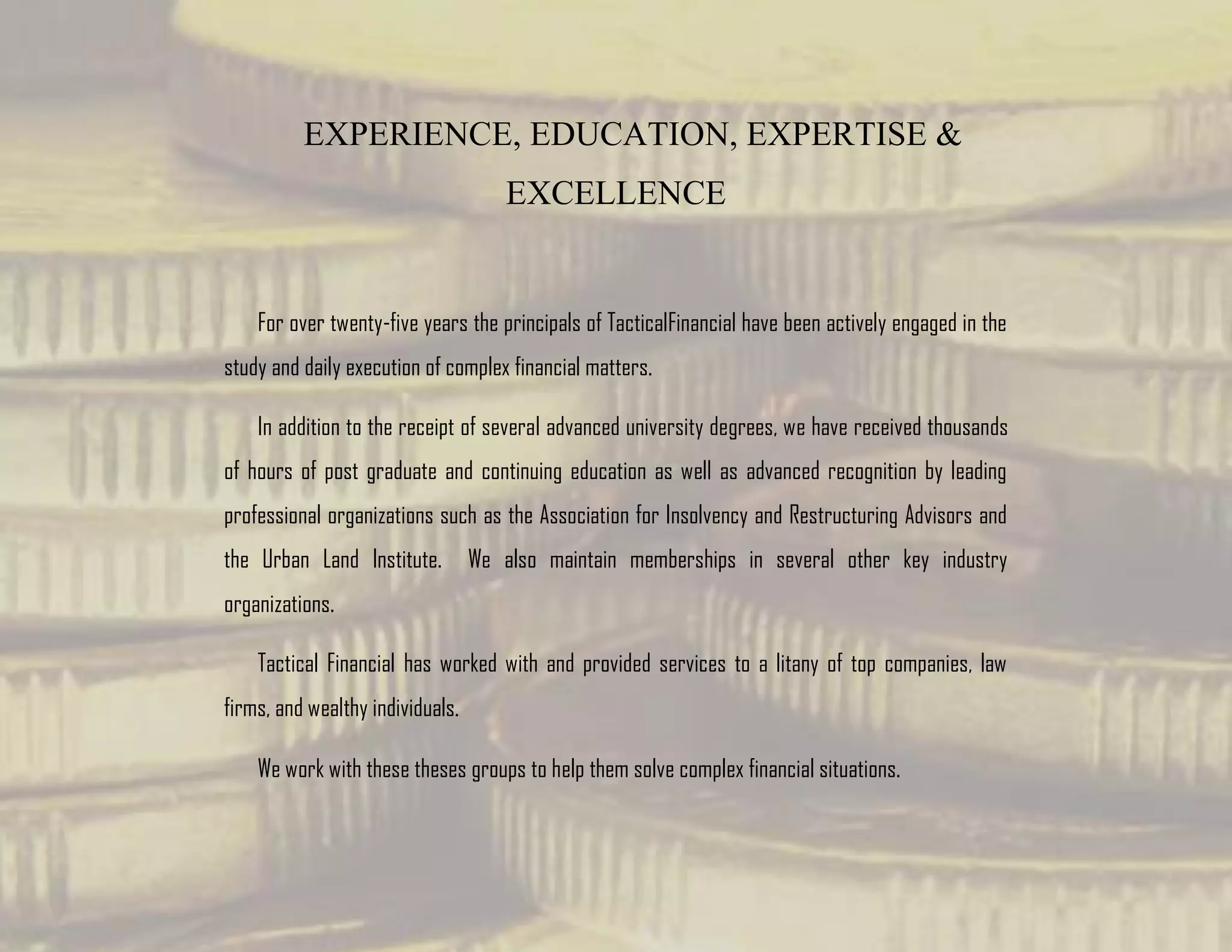 The document discusses TacticalFinancial, a financial advisory firm with offices in Atlanta, Naples, Phoenix, and Tallahassee. It summarizes that TacticalFinancial has over 25 years of experience in complex financial matters and its principals have received advanced degrees and continuing education. TacticalFinancial provides services to companies, law firms, and wealthy individuals to help solve complex financial situations.