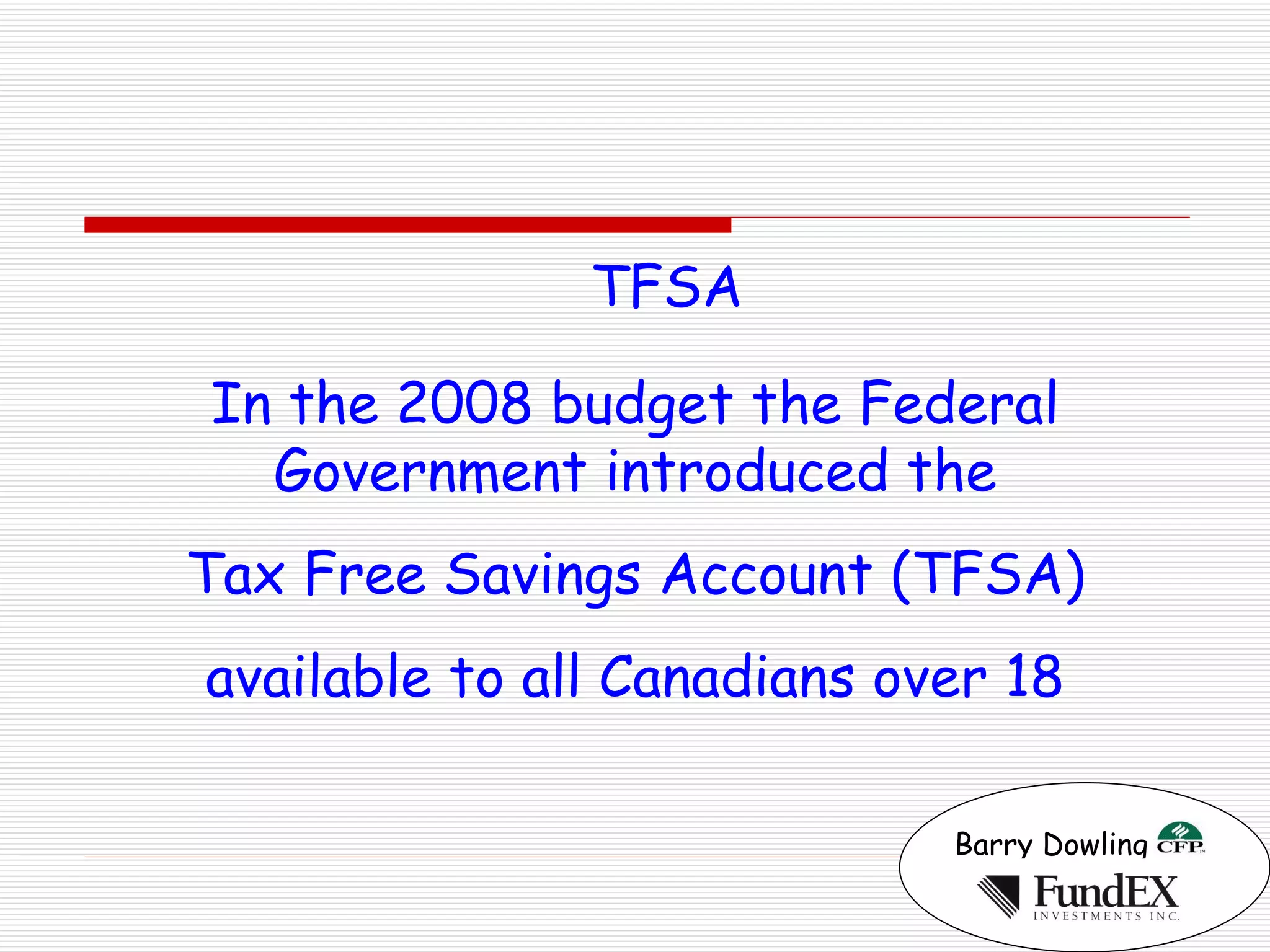 The document discusses the Tax-Free Savings Account (TFSA) introduced by the Canadian government in 2008. Key points: