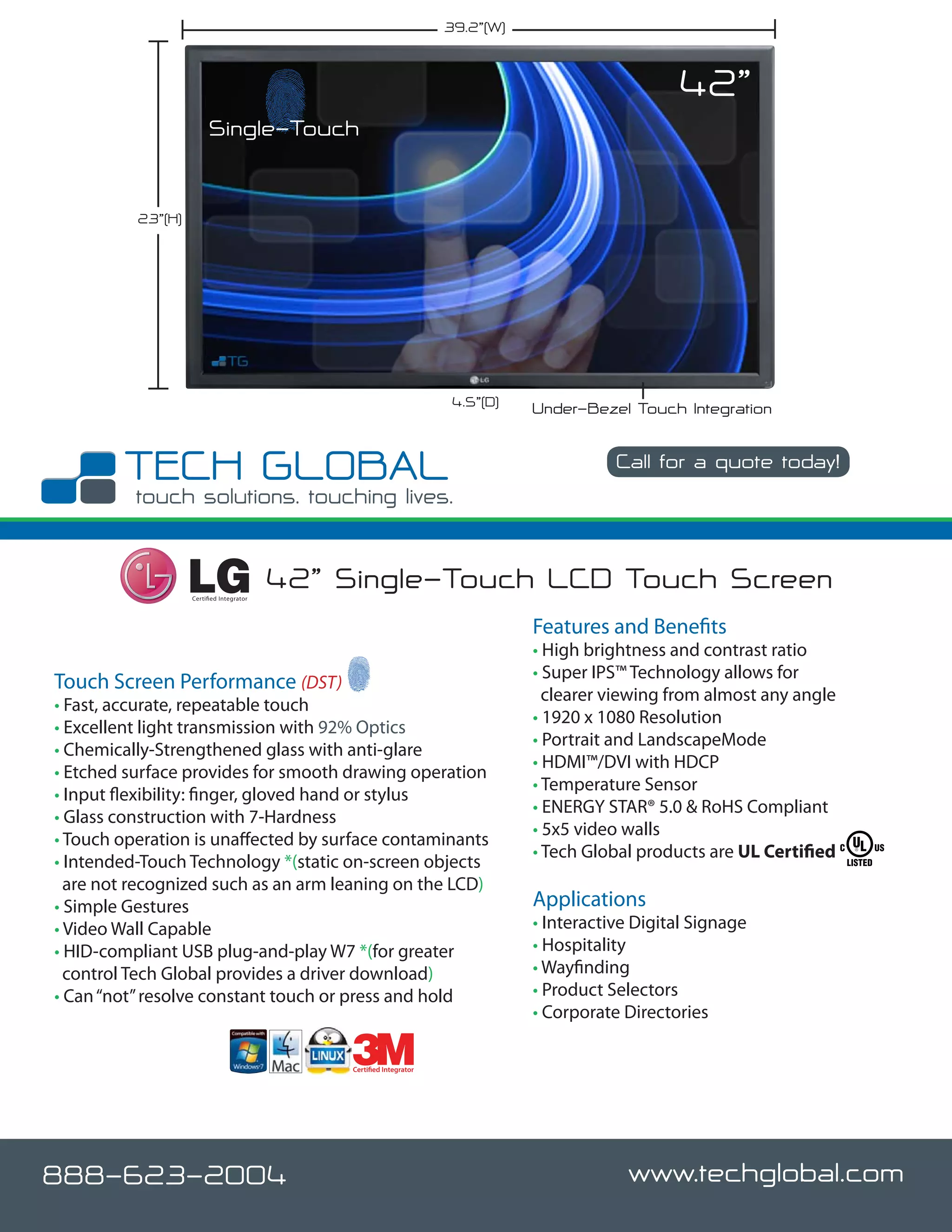 This document summarizes the specifications of a 42-inch single-touch LCD touch screen. Key features include a high brightness and contrast ratio, 1920 x 1080 resolution, touch sensitivity to fingers or styli, video wall capability, and USB and HDMI connectivity. It is intended for applications like digital signage, wayfinding, and product selection where interactivity is desired. The touch screen offers durability and optical clarity from a chemically-strengthened glass construction.