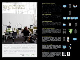 The document describes the Samsung 19" single-touch PCoIP LCD touch screen. It has a durable capacitive touch screen, high accuracy, optical glass construction, and antimicrobial properties. It supports VMware View virtual machines with full graphics performance. As a zero-client device, it provides security since software and data are on centralized host platforms. It offers low maintenance costs and easy access to graphics-heavy applications like CAD.