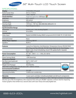 This document summarizes the features of a 32-inch multi-touch LCD touch screen. It has 20-point multi-touch capability, a projected capacitive touch interface that supports finger, thin gloves and stylus input. Additional features include HD 1366x768 resolution, 450 cd/m2 brightness, 6000:1 contrast ratio, and plug-and-play compatibility with Windows 7. It is suited for applications such as digital signage, hospitality, wayfinding, kiosks and product selection.