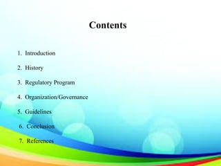 The document provides an overview of various regulatory authorities, including the Therapeutic Goods Administration (TGA) in Australia, the Medicines and Healthcare Products Regulatory Agency (MHRA) in the UK, and the Medicines Control Council (MCC) in South Africa, detailing their roles in ensuring the safety and efficacy of therapeutic goods. It discusses the regulatory programs, guidelines, and organizational structures involved in the assessment and monitoring of medicines and medical devices, emphasizing the importance of compliance with good manufacturing practices. The conclusion highlights the need for a robust regulatory framework to maintain consumer confidence in the quality and safety of complementary medicines.