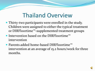 The document summarizes two studies on interventions for children with autism. The Thailand study involved 32 children who received either typical treatment or DIRFloortime supplemented treatment for 3 months. Parents in the intervention group added 15 hours per week of DIRFloortime. Children in this group showed greater improvements on assessment scales compared to typical treatment. The Canada study was a randomized controlled trial of 51 children who received either DIRFloortime therapy and coaching or community treatment. Children in the DIRFloortime group showed significantly greater improvements in social interaction capacities like attention, involvement, and joint attention.