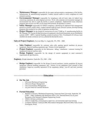 The document is a resume for Tracy Givens, who has over 28 years of experience in mechanical engineering, project management, and facilities management. Givens currently works as the Plant Engineer for Emerson Electric, where she manages a manufacturing facility, leads process improvement initiatives, and oversees maintenance, environmental compliance, and safety. Prior experience includes roles in sales engineering, project engineering, and design engineering for other companies. Givens has a Bachelor's degree in Mechanical Engineering and various training certifications.