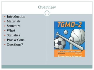 This document provides an overview of the Test of Gross Motor Development - 2nd Edition (TGMD-2), which measures gross motor skills in children ages 3 to 10 years. The TGMD-2 assesses 12 skills across two subtests of locomotor skills like running and galloping, and object control skills like throwing and catching. It takes 15-20 minutes to administer and uses common equipment like balls and bean bags. The TGMD-2 has good reliability and validity for assessing gross motor skills in typically developing children as well as those with conditions like cerebral palsy or autism spectrum disorder.