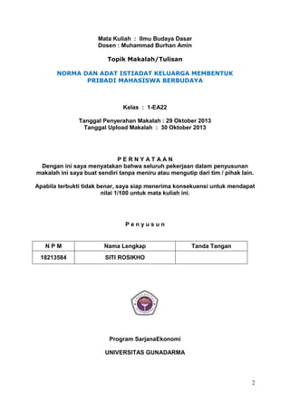 Norma dan adat istiadat keluarga memainkan peran penting dalam membentuk pribadi mahasiswa yang berbudaya. Makalah ini membahas bagaimana norma-norma sosial dan adat tradisional keluarga dapat mempengaruhi sikap dan perilaku anak. Dijelaskan pula tantangan yang dihadapi dalam penerapan nilai-nilai budaya keluarga di era modern. Kesimpulannya, peran orang tua dalam mengajarkan norma dan adat istiadat kepada