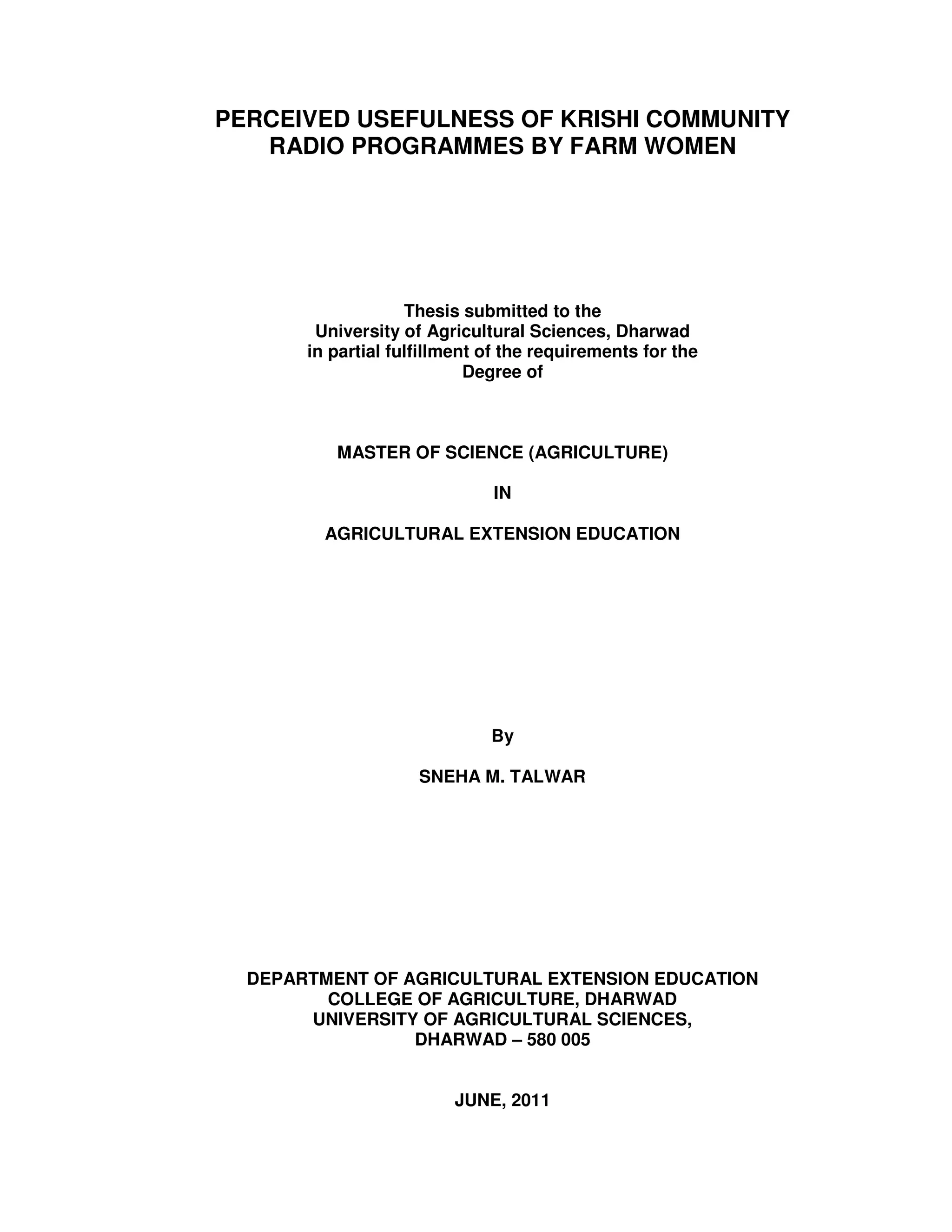 This document is a thesis submitted by Sneha M. Talwar to the University of Agricultural Sciences, Dharwad in partial fulfillment of the requirements for a Master of Science degree in Agricultural Extension Education. The thesis studies the perceived usefulness of programs on the Krishi Community Radio station by farm women in Dharwad district, Karnataka. It provides background on the establishment of community radio in India and the Krishi Community Radio station at the University of Agricultural Sciences, Dharwad. The objectives are to study awareness of and listening to the radio programs among farm women, their preferences for different types of programs, and factors influencing listening behavior. The study is limited to 8 villages within 20km of the radio station