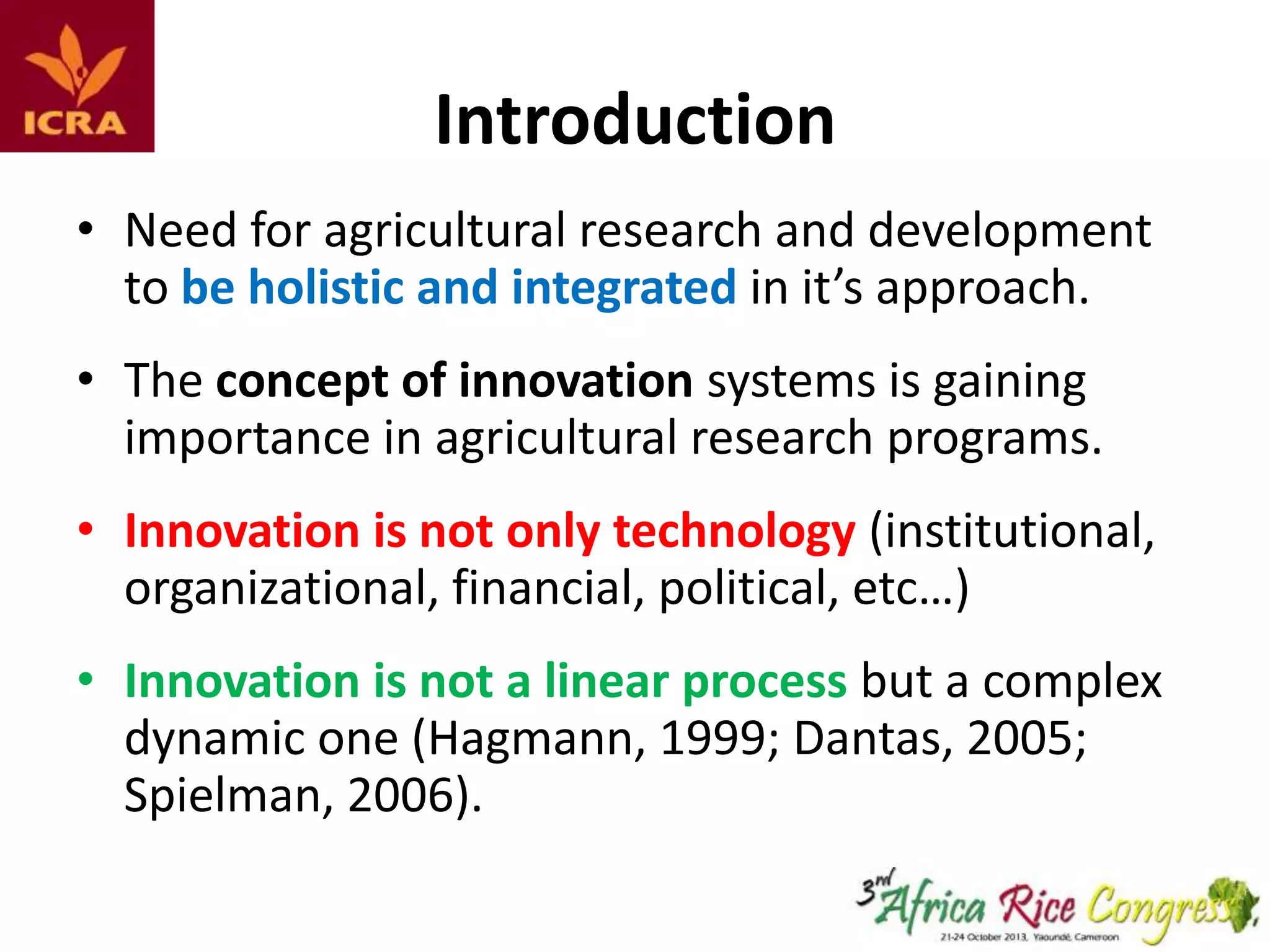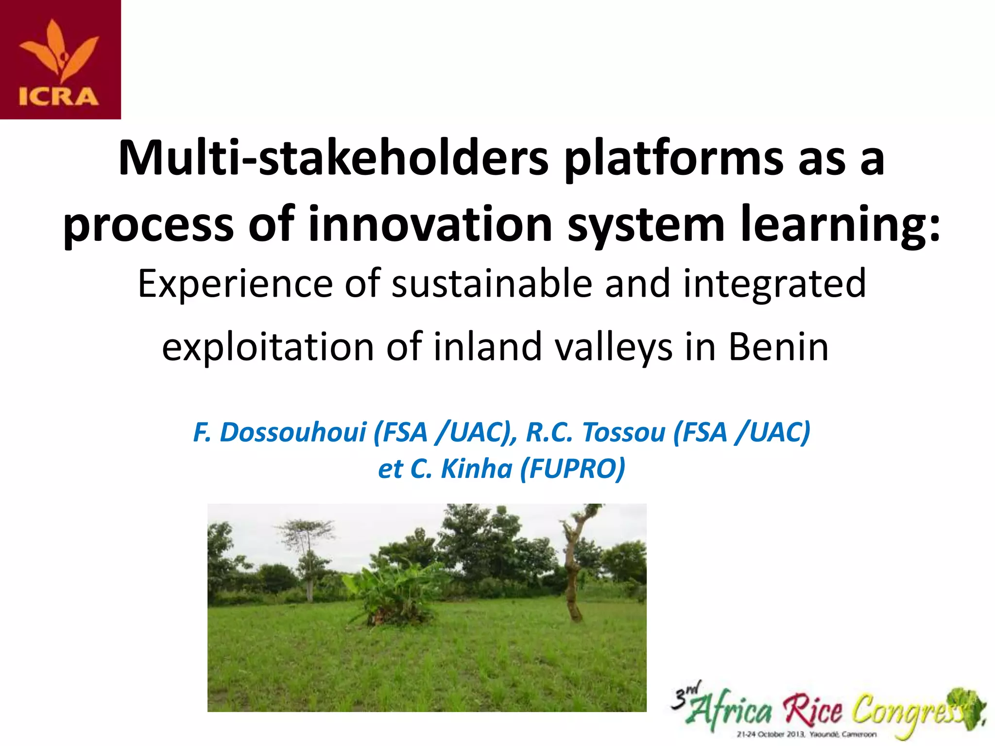 The document discusses the process of building multi-stakeholders platforms (MSPs) for innovation system learning in the sustainable exploitation of inland valleys in Benin. It highlights the importance of holistic agricultural research, the roles of various stakeholders, and the phases of MSP development, emphasizing facilitation and capacity building. The results indicate improvements in collaboration, partnership development, and tangible outputs, while also acknowledging challenges in stakeholder alignment and the need for ongoing training.