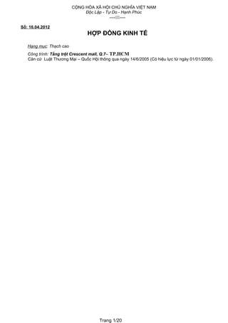 Hợp đồng kinh tế giữa Công ty CP Xây dựng Kiến trúc Ân Gia và ông Lương Ngọc Hoan về thi công hạng mục thạch cao tại Crescent Mall, TP.HCM, có giá trị 63.400.000 VNĐ. Hai bên đã thống nhất các điều khoản về công việc, thời gian thực hiện, phương thức thanh toán và trách nhiệm của mỗi bên. Hợp đồng có quy định rõ về việc xử lý vi phạm và điều kiện chấm dứt hợp đồng.