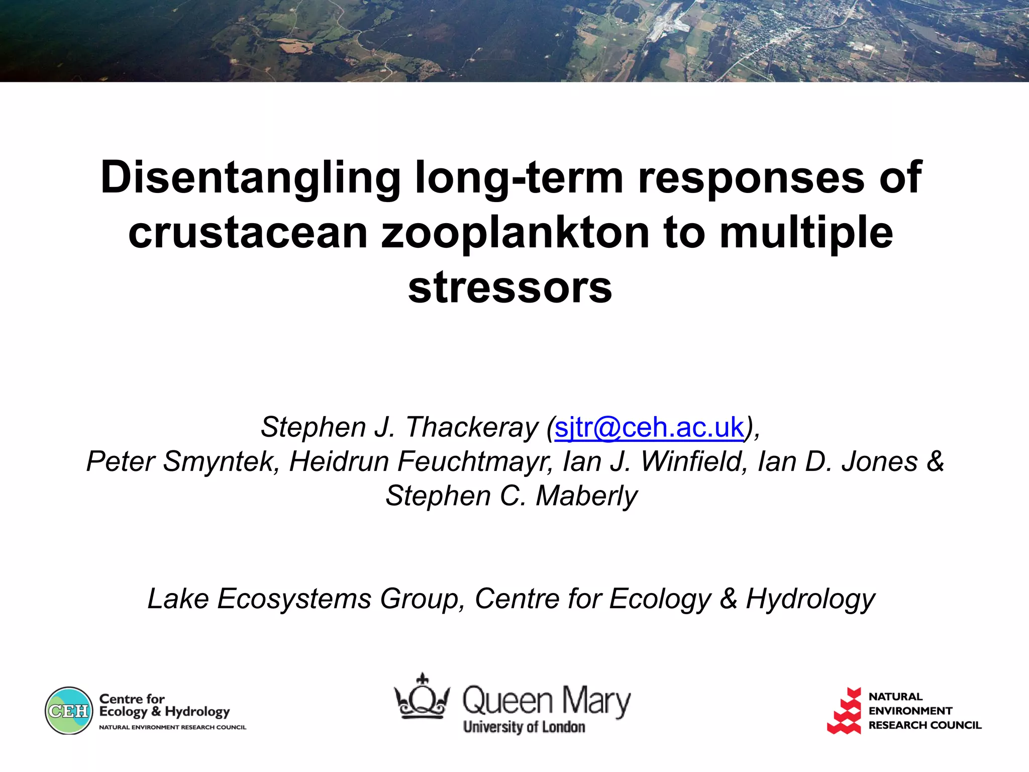This document summarizes a study analyzing the long-term responses of crustacean zooplankton populations in Windermere, England to multiple stressors including climate change, eutrophication, and the expansion of non-native fish species. The study used statistical models to analyze long-term monitoring data from 1991-2010 on zooplankton abundance, water temperature, phytoplankton biomass, predatory zooplankton, and fish abundance. For the species Eudiaptomus, the top model identified effects of increased chlorophyll (food) and planktivory by fish. While some population change was explained, much variation remained unexplained, warranting further exploration of