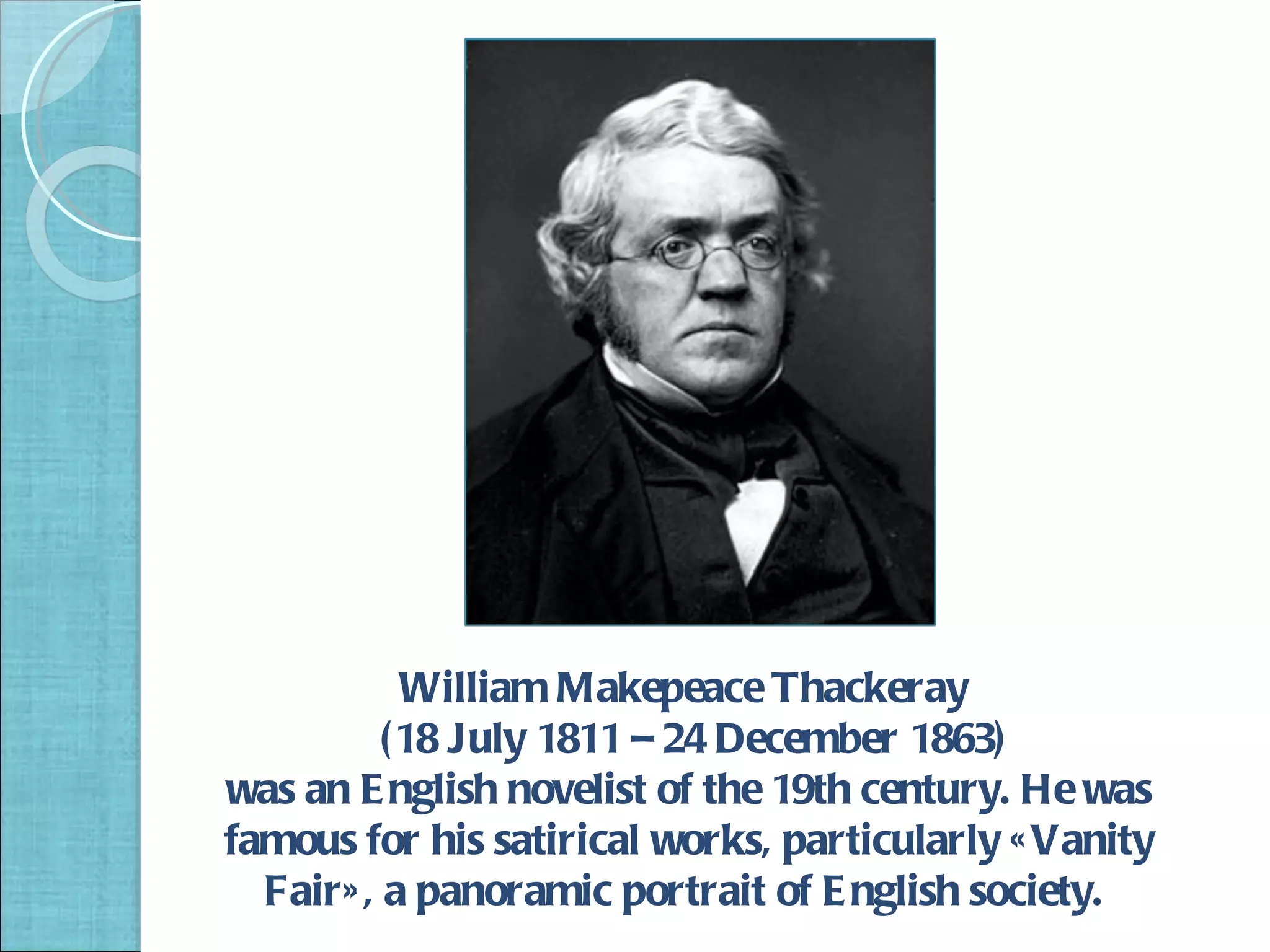 He was born in Calcutta, India and studied in both London and Cambridge. Some of his earliest writing appeared in university publications. After traveling on the continent, he began studying law but soon gave it up. His most famous work, "Vanity Fair", was written as a series in a magazine without a precise plan. It portrayed English society through central characters and surrounding incidents. Thackeray became prominent in London society and had successful works that satirized vices through moral depictions of life.
